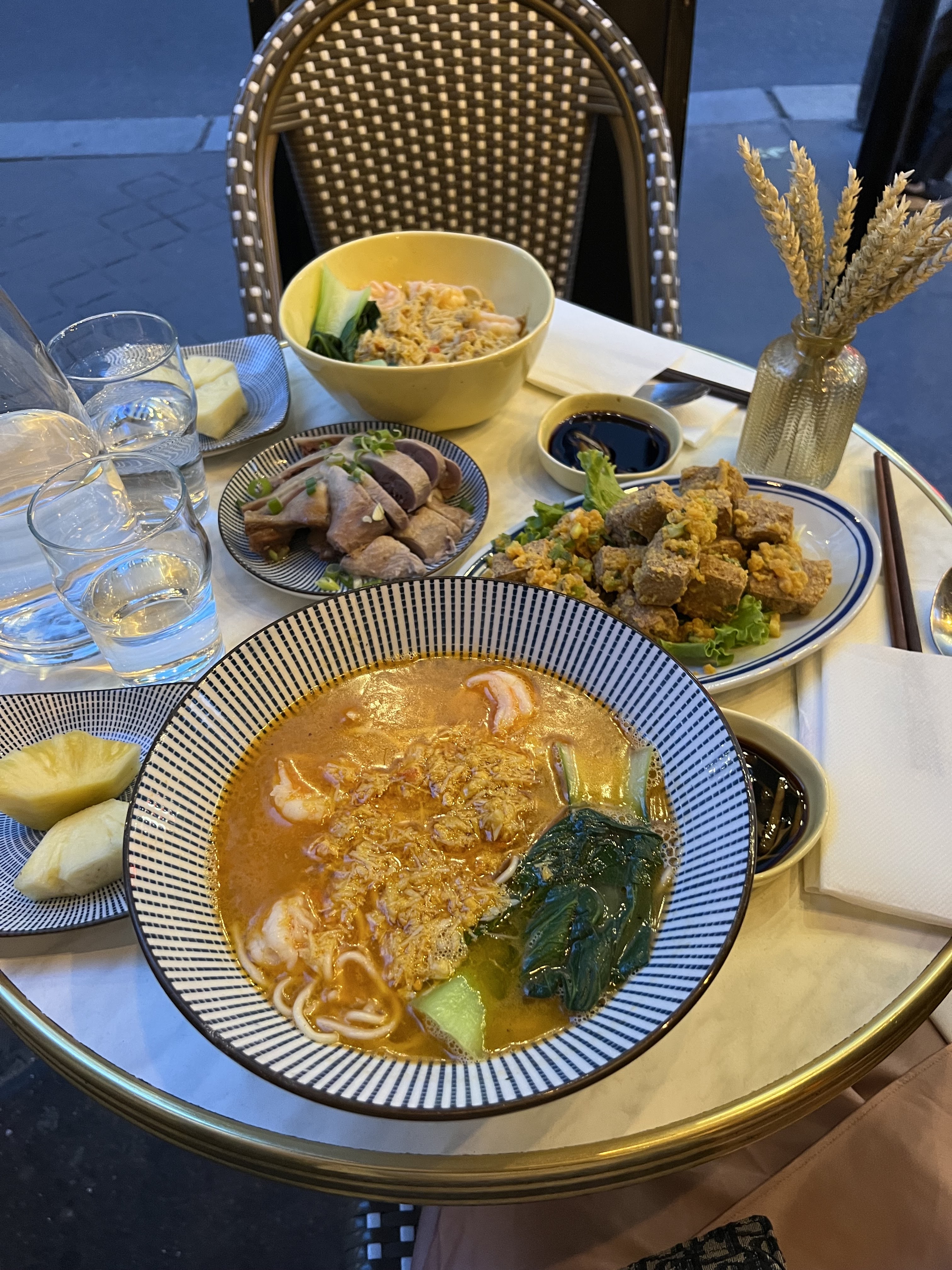 Nous sommes tombés dessus par hasard et nous avons été conquis par la gentillesse du personnel et le goût riche de leurs plats. Je recommande fortement la soupe de crabe et crevette ✨️ Leurs plats sont copieusement garnis et très riches en saveur. C'est un tout petit restaurant avec peu de tables mais il n'y a pas de queue dû à son emplacement, il est moins marquant que les autres restaurants du quartier. Ils ont une carte de thé plutôt large pour un restaurant et on les voit utiliser leur herbes fraîches qui sont disposées comme décoration. J'y retourne avec plaisir à chaque fois.