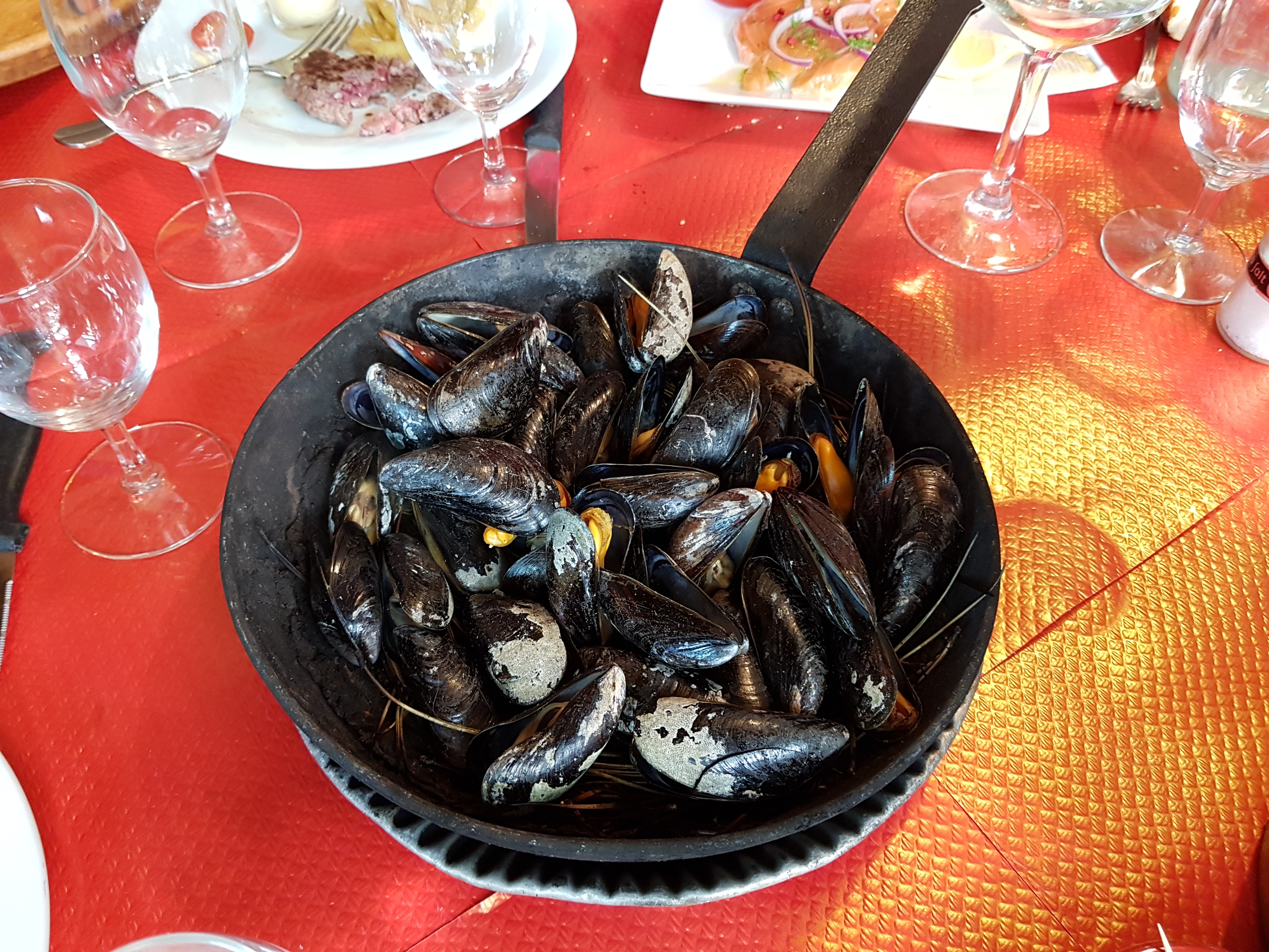 Eclade de moules sur lit d'épines cuites au feu de bois excellent Accueil chaleureux et copieux personnel sympathique Je recommande