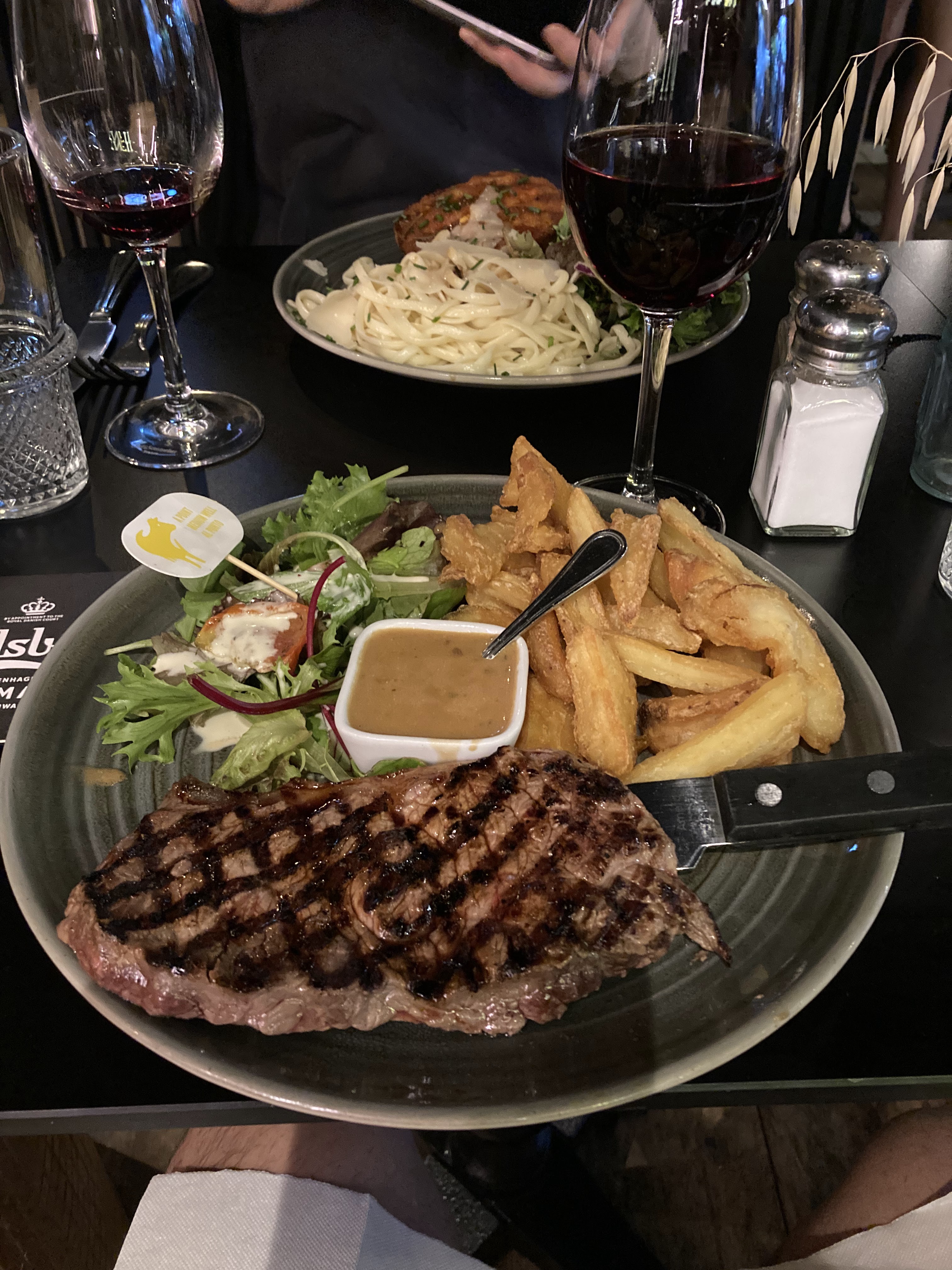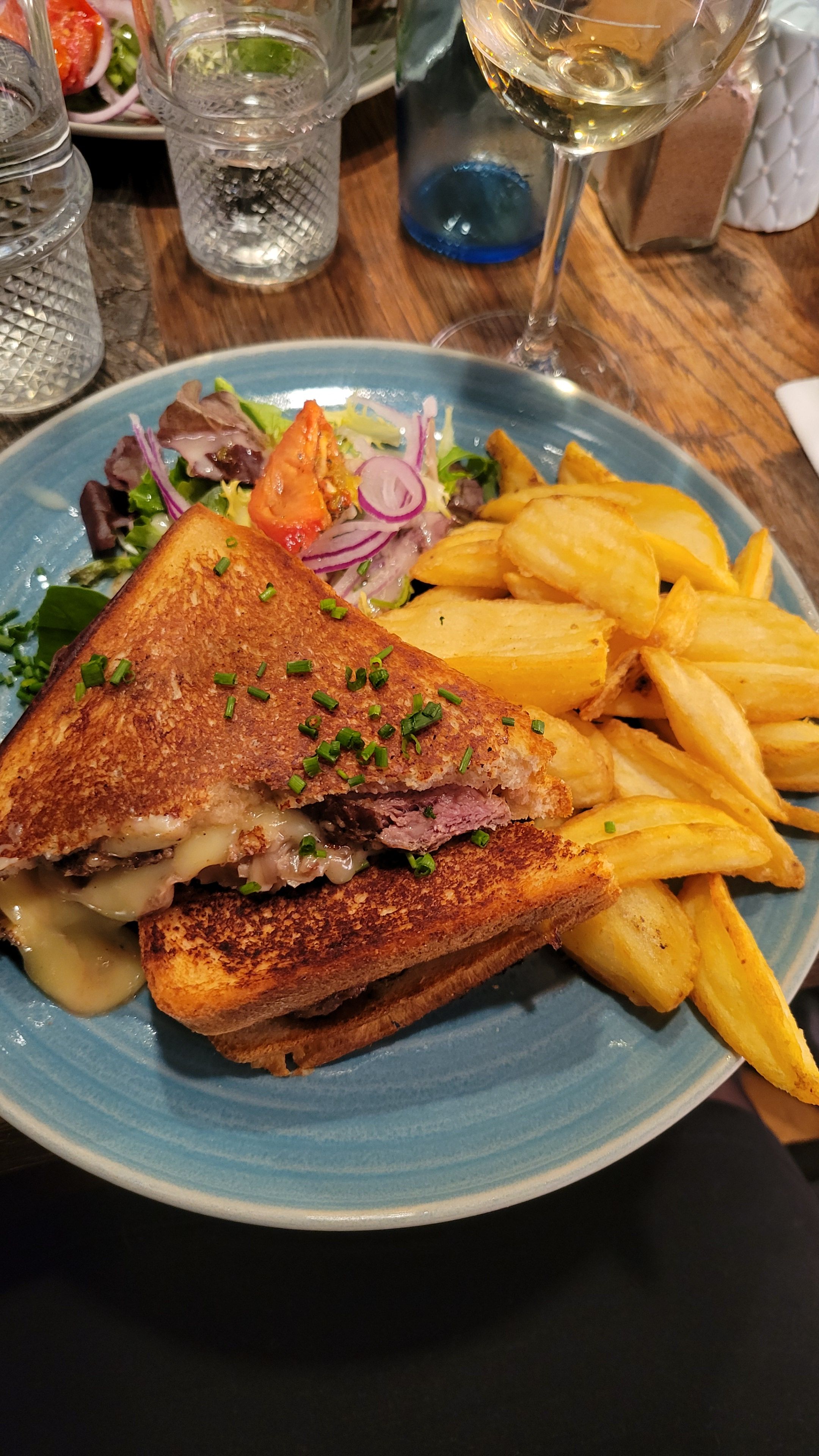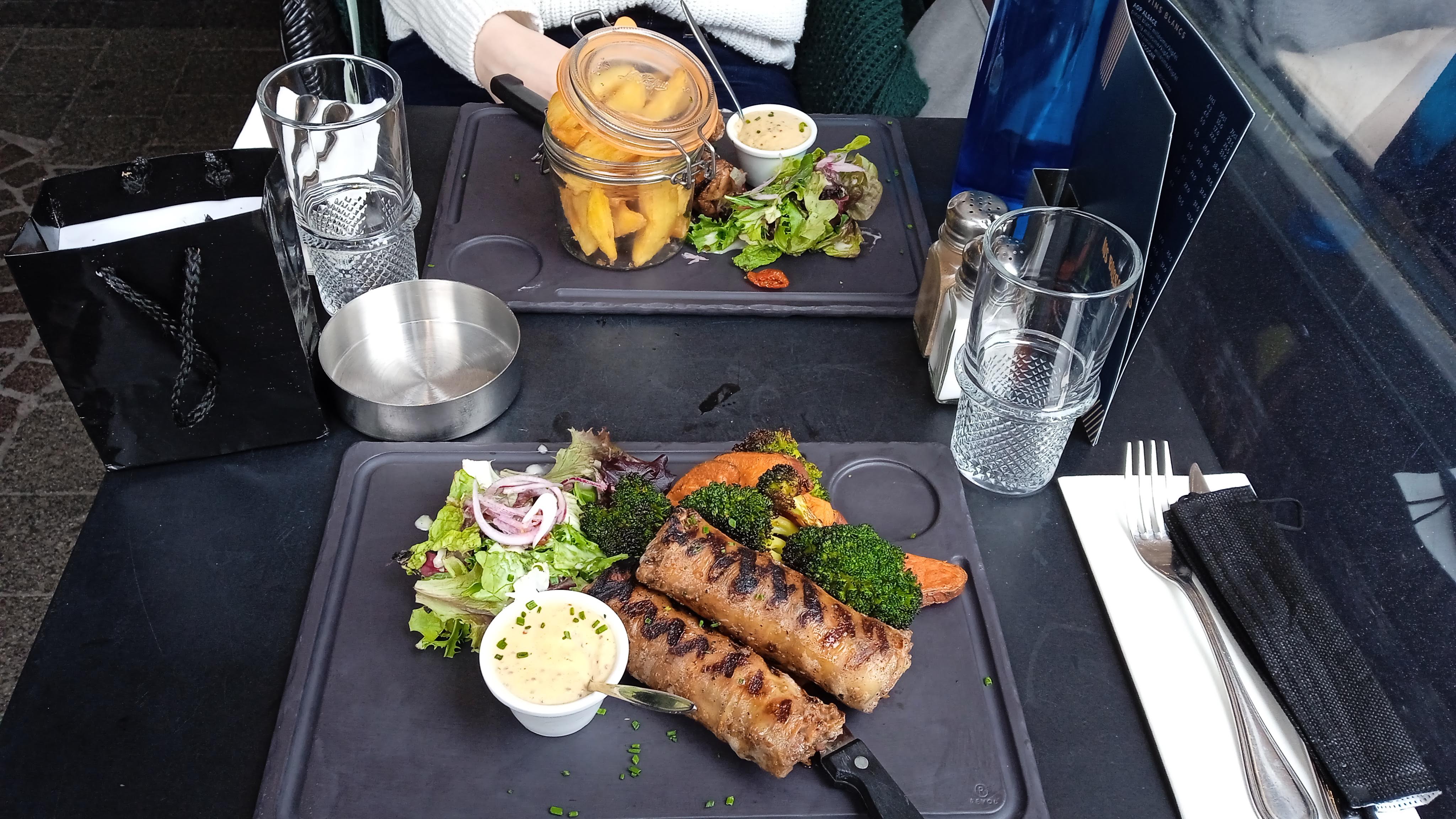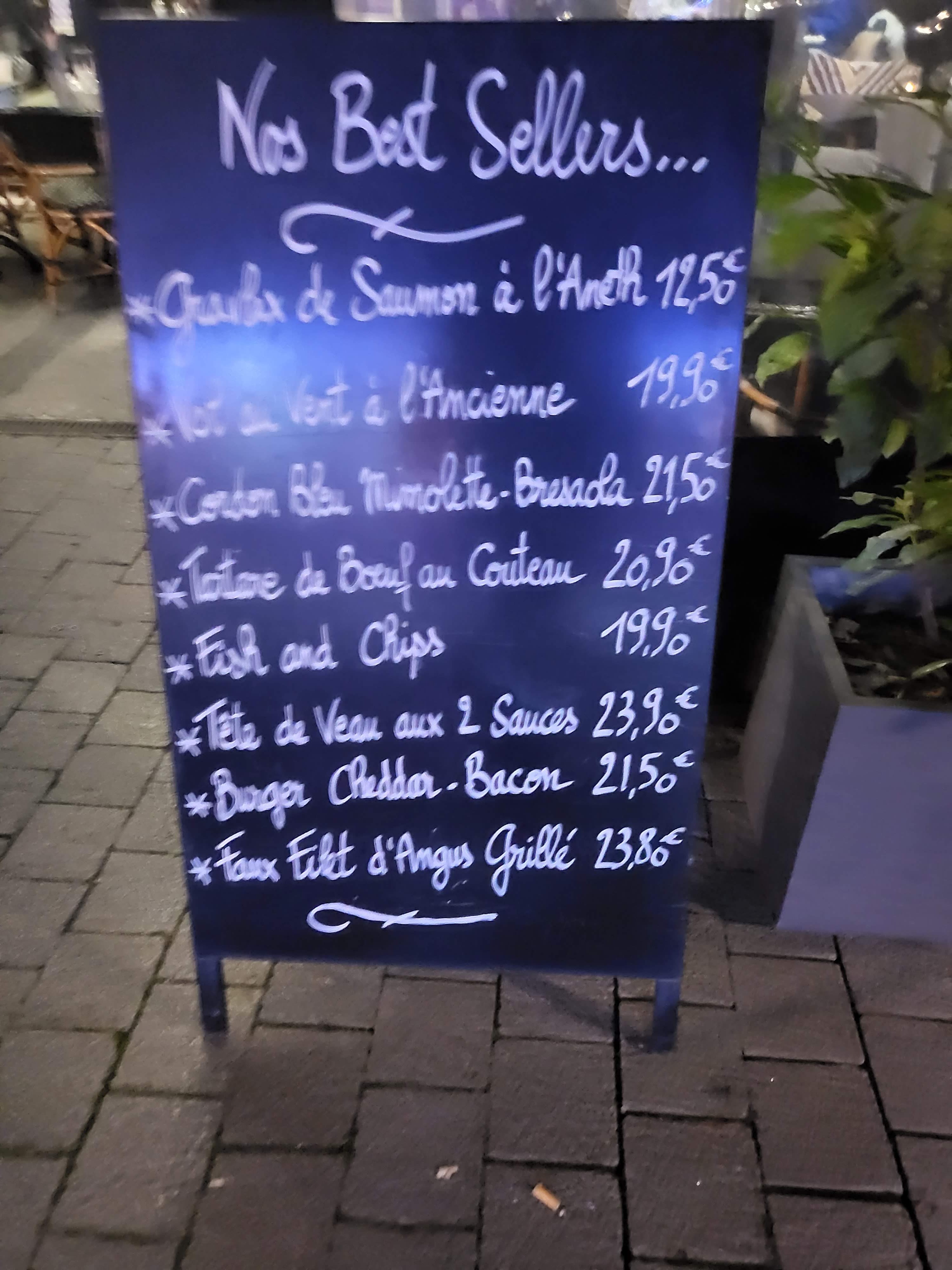 J'ai pris un faux filet Angus....accompagné de frites et d'une salade. Le resto est bien placé avec un service de qualité, mais dans un resto l'important c'est la qualite de la nourriture. Pour 24 euros 50, la viande Angus était loin d'être de bonne qualité, les frites en sachet, la sauce au poivre sous vide, et la salade minuscule. Ma femme a pris une salade vosgienne très très grasse selon elle.