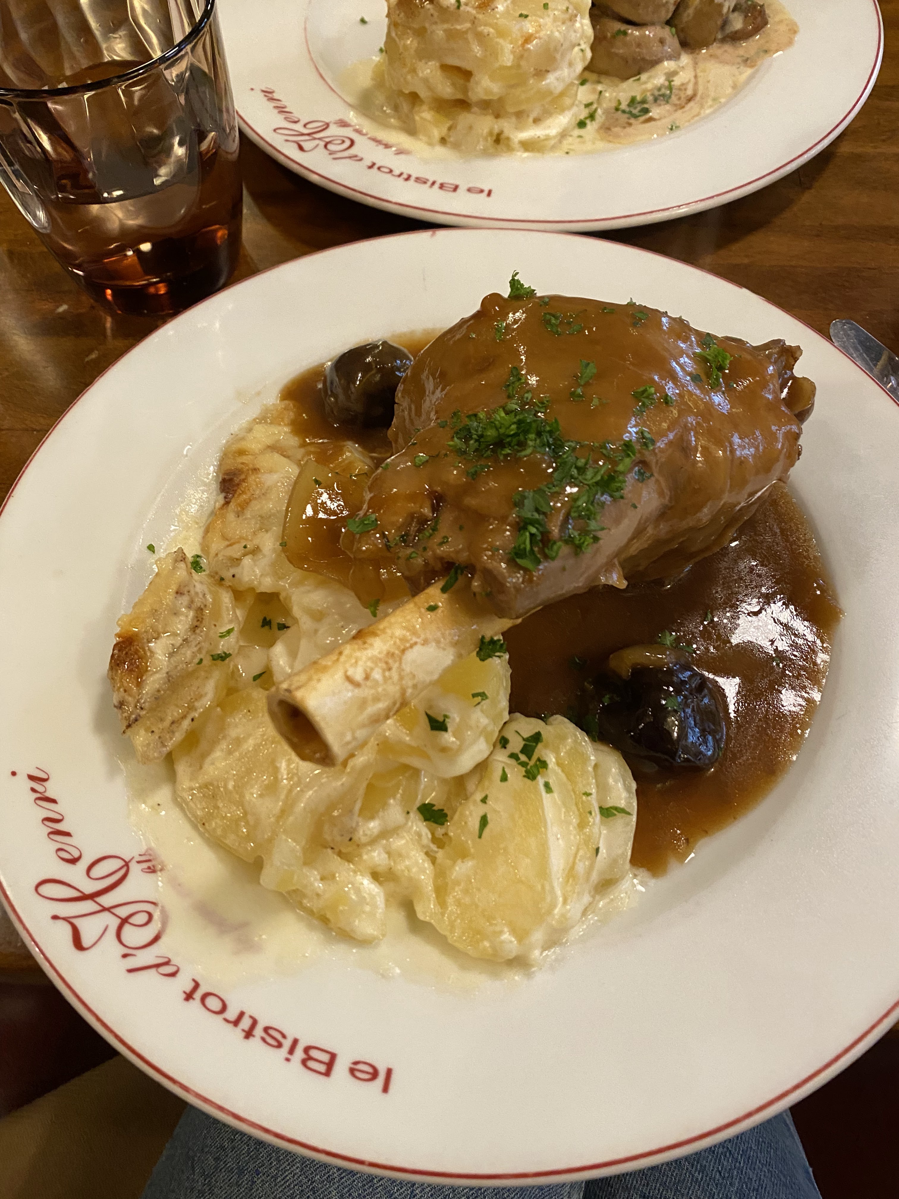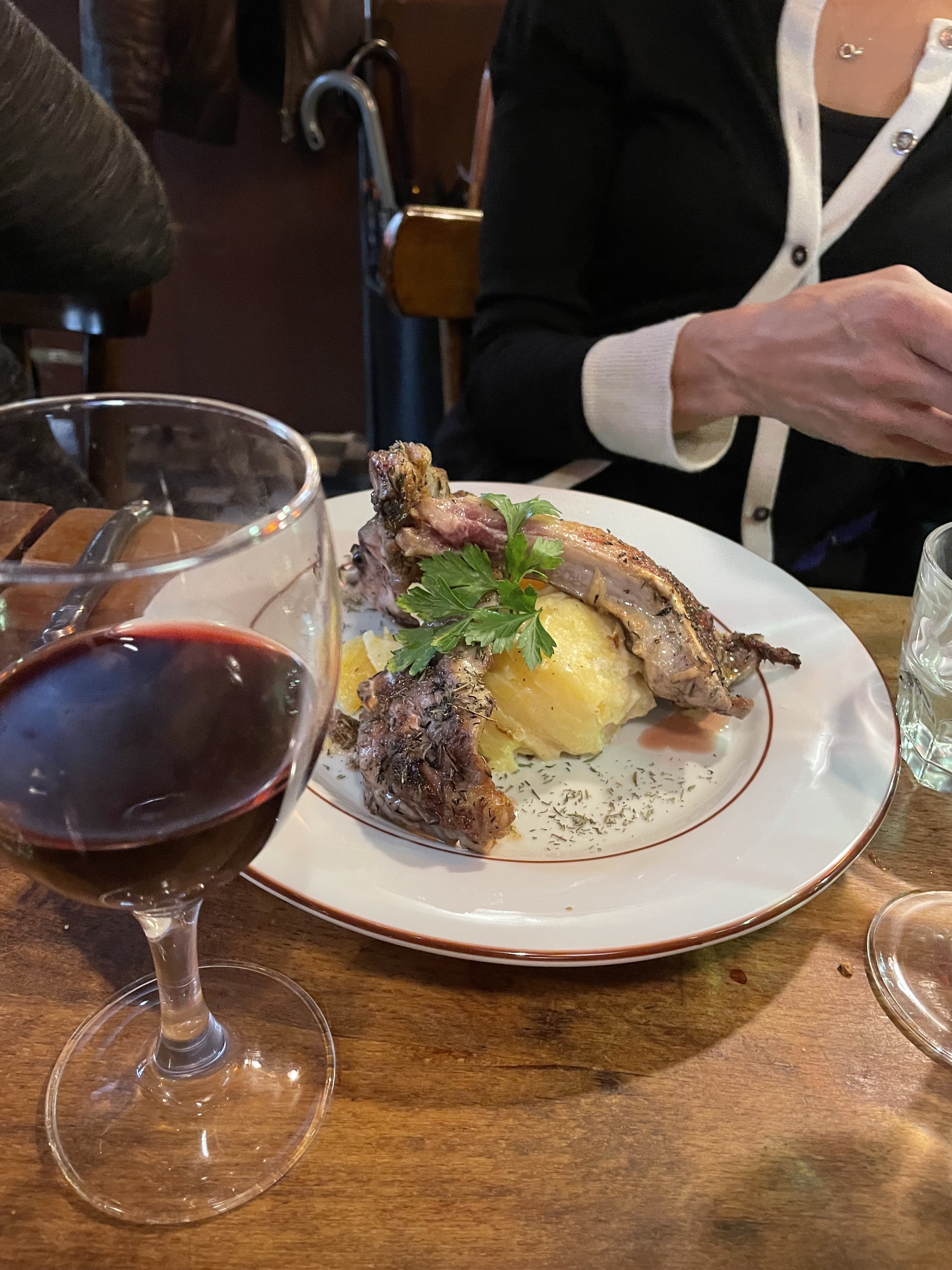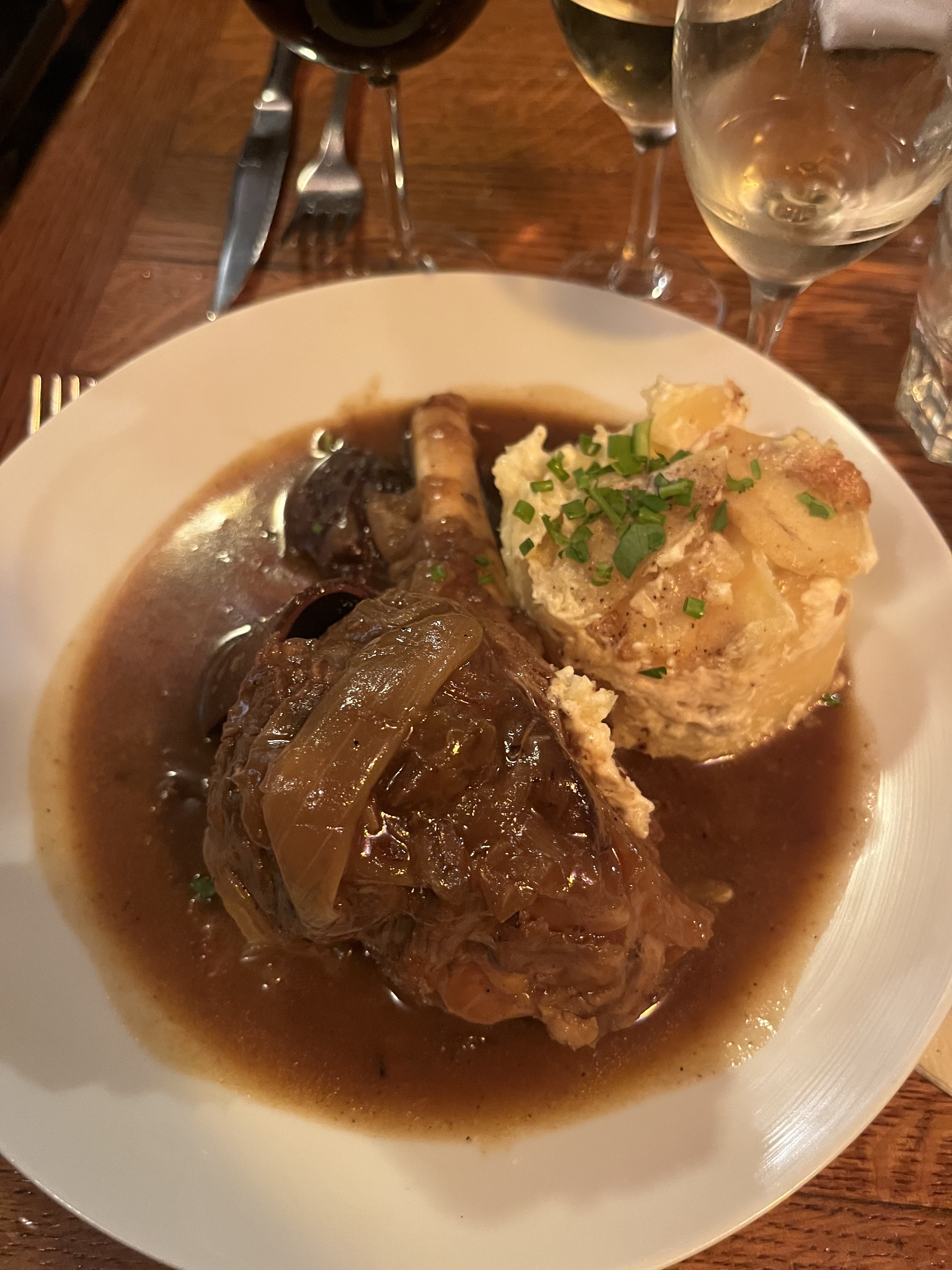 Rillettes d'Oie, Petit Chèvre Chaud, Boeuf bourguignon pommes vapeur, Agneau de Sept Heures aux Pruneaux was excellent. Good wine, very friendly