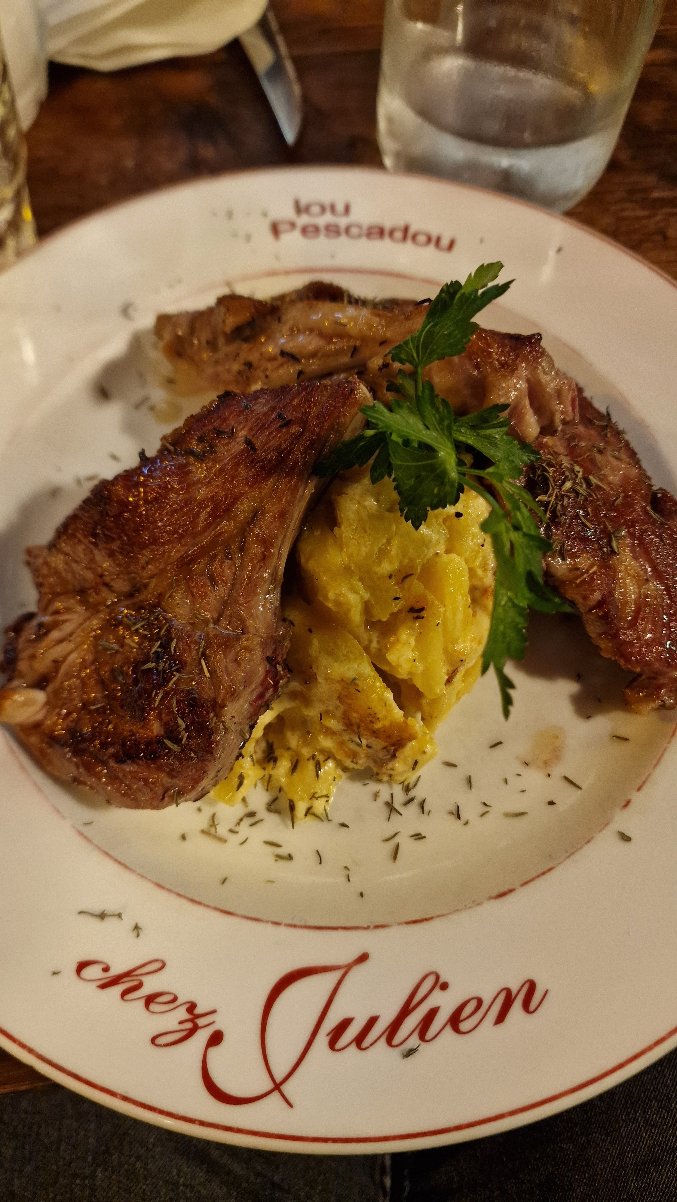 Repas un peu cher pour une petite part de gratin et une toute petite souris d agneau. Entrecôte sans sauce ni salade Qualité de la viande moyenne heureusement agrémentée d épices et d un os à moelle Lieu convivial Bon accueil Mais qui a besoin d un rafraîchissement.
