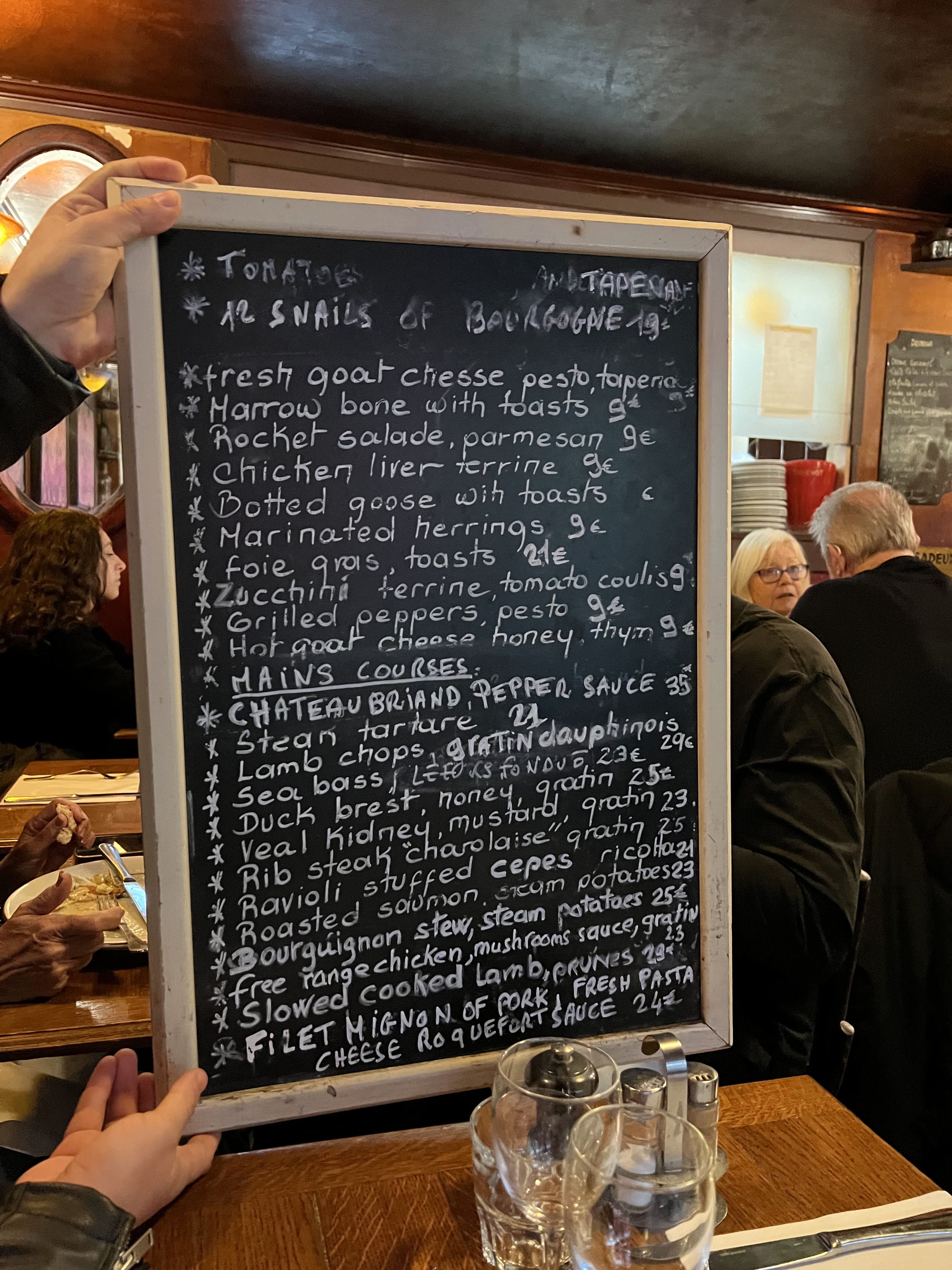 Voilà un bon petit bistrot bien parisien avec un accueil bien attentionné et ses petits dysfonctionnements à la bonne franquette. Une carte et une ardoise des plats du jour. Pour l'ardoise c'est du grand restaurant, mentions spéciales pour les escargots et les lentilles du puy en entrée, un petit bémol pour la carte. Ça reste un bel endroit bien sympa pour un déjeuner entre potes et même en amoureux aventuriers.