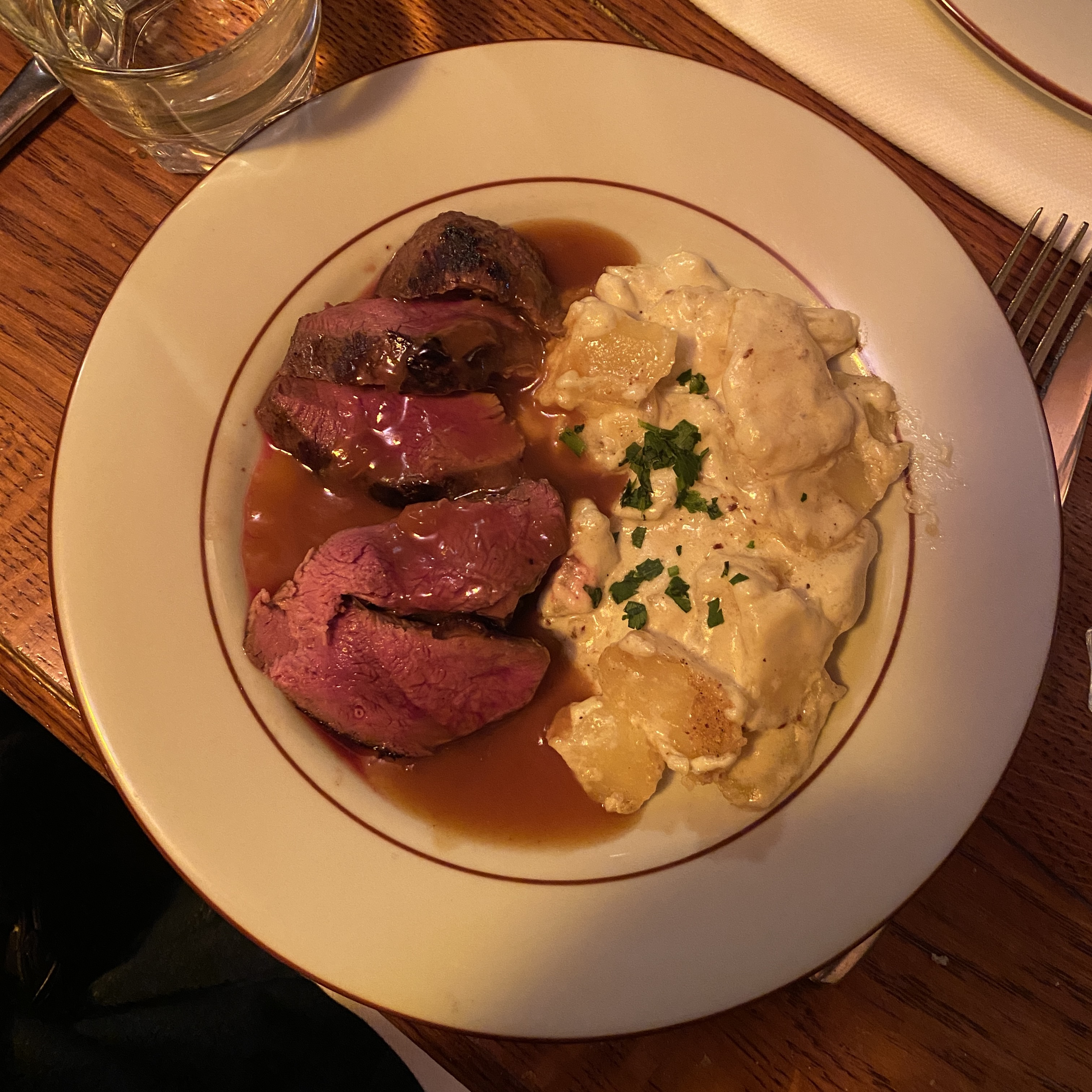 Je suis arrivé 15 minutes plus tôt sans réservation, mais un gentil monsieur m'a permis de me reposer à l'abri du froid. J'ai vraiment adoré l'ambiance chaleureuse et chaleureuse de ce restaurant. Le filet mignon de porc était servi avec des pâtes et ils ajoutaient de la moutarde de Dijon à la sauce roquefort. Tellement délicieux jusqu'à la dernière bouchée ! Mon verre de vin rouge était également accompagné de saucisson. Merci d'avoir pris soin de ce dîner solo !