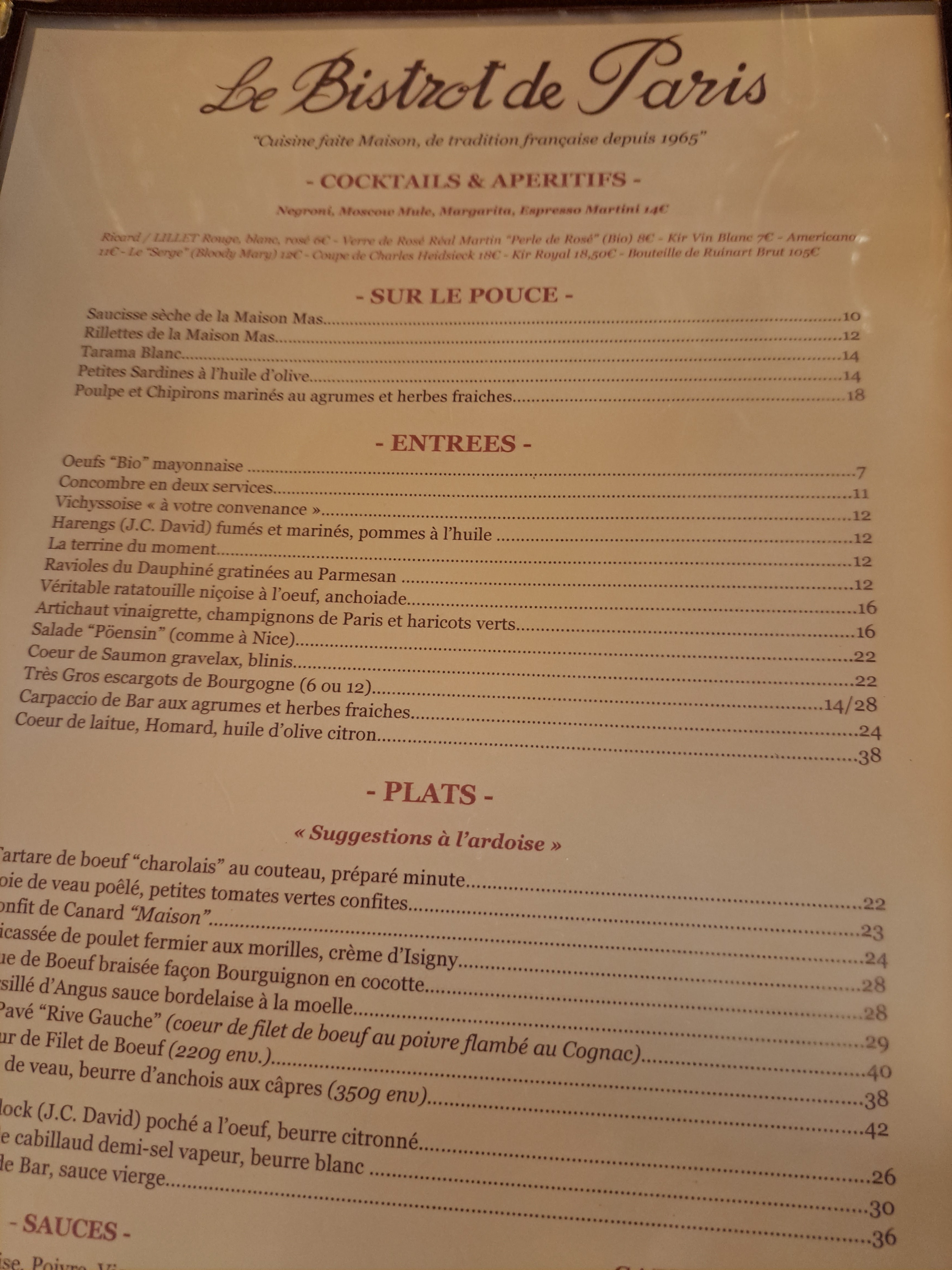 Cela fait plusieurs années maintenant que j’ai mon rond de serviette dans ce magnifique établissement qui est le << Bistrot de Paris >> à Saint Germain en laye. (78) Grand service de qualité avec un renouvellement au quotidien de la formule, menus très créatifs par le Chef et le responsable, surtout avec des produits frais et un large choix au niveau de la carte des vins. Bravo à son responsable et son équipe, pour leur gentillesse et professionnalisme. Longue vie à cet établissement à l’esprit Bistrotier, Convivial et familiale ! Sincèrement.