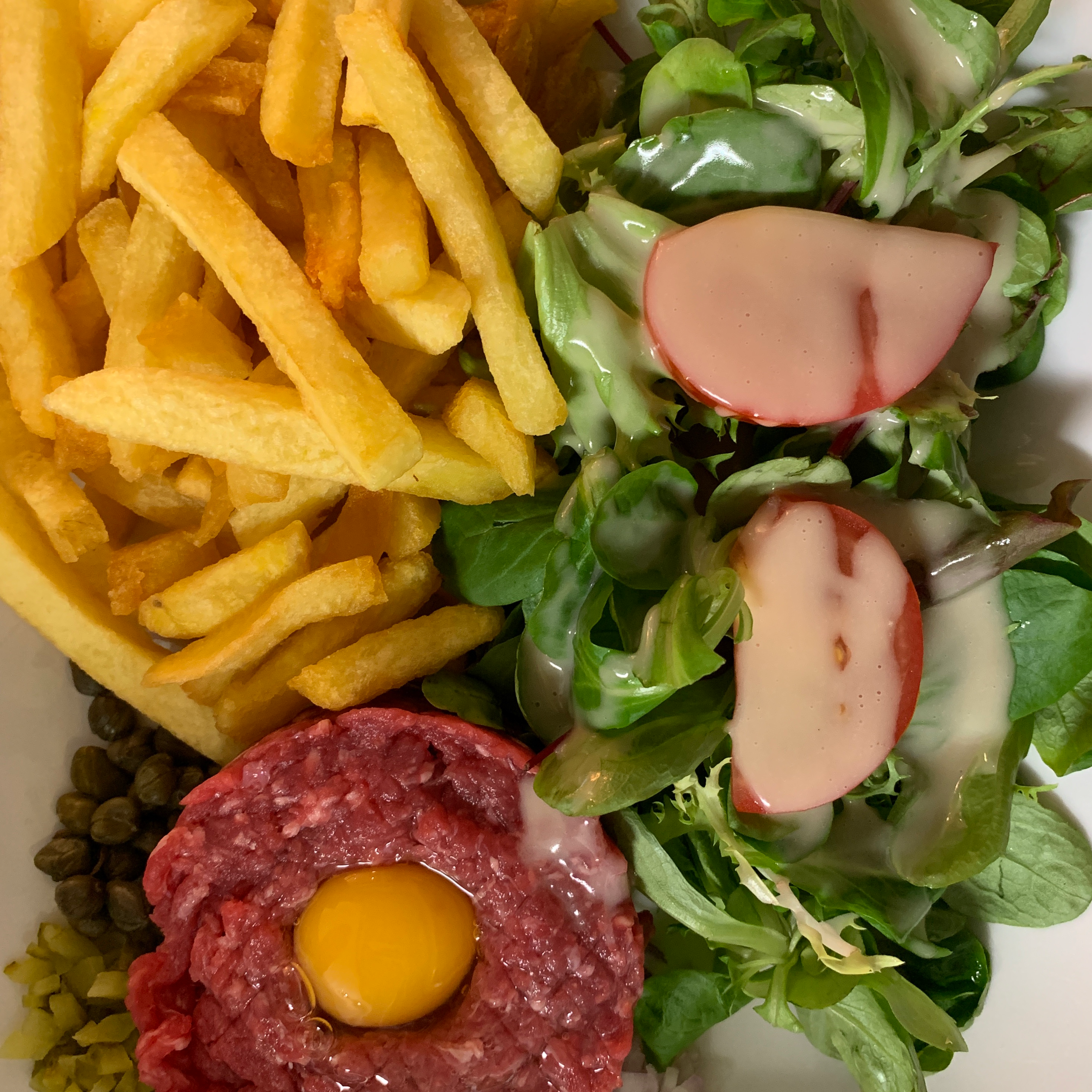 A croire que la situation si particulière que nous avons connue n’aura pas redonné l’envie à ce restaurateur de produire de la qualité, autant dans ses plats que dans son service. Une attente interminable et ce, ne serait-ce que pour avoir au moins les cartes. Cette attente aurait été comprise et tolérée si, du moins, les plats servis avaient été acceptables : frites surgelées, salade verte en sachet noyée dans de la vinaigrette bon marché (voire supermarché…), pain de mie industriel… Et tout cela à des prix dépassant ceux applicables en brasserie. En bref, très mauvais rapport qualité-prix (si tant est que nous puissions parler de « qualité »)