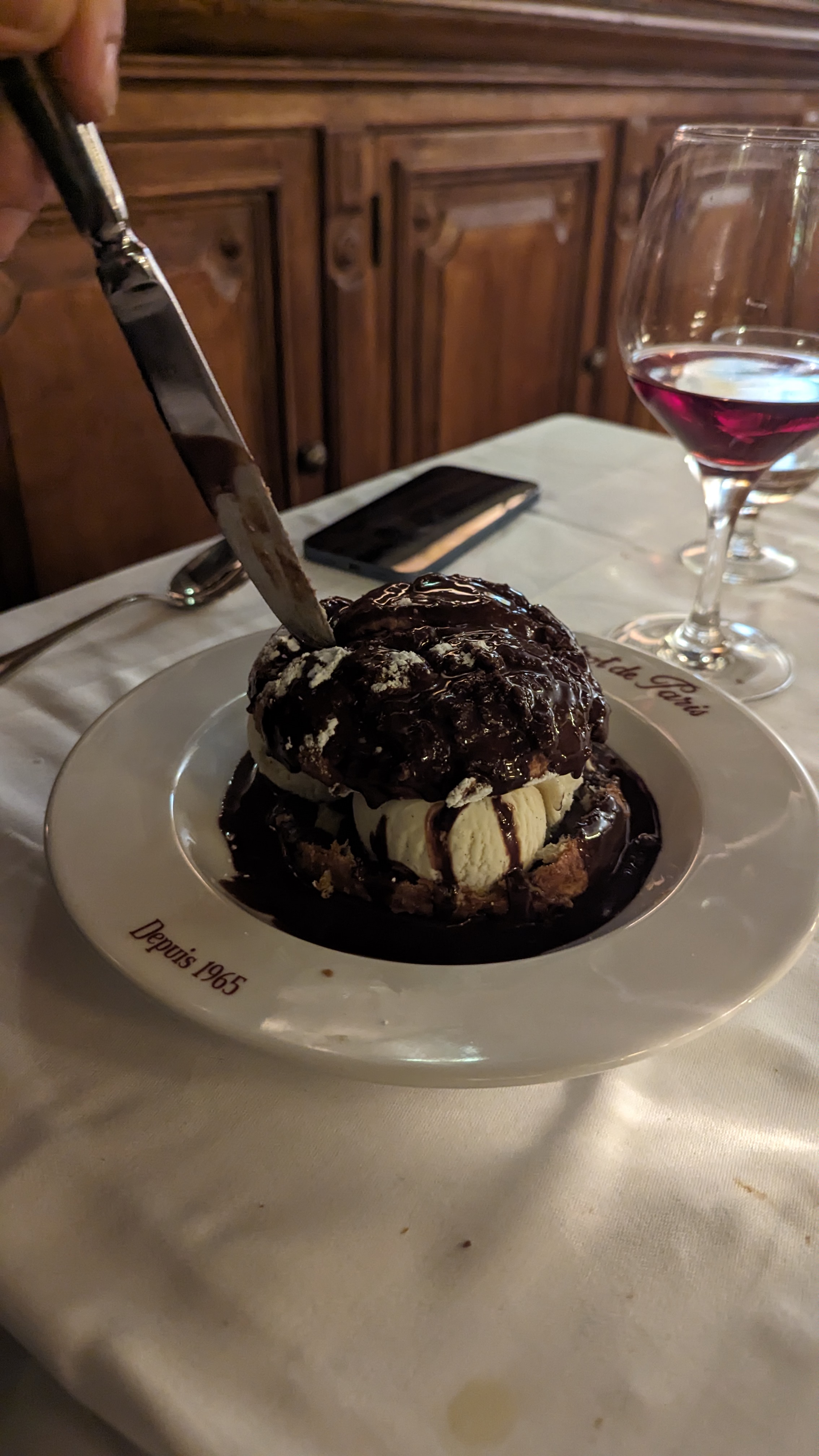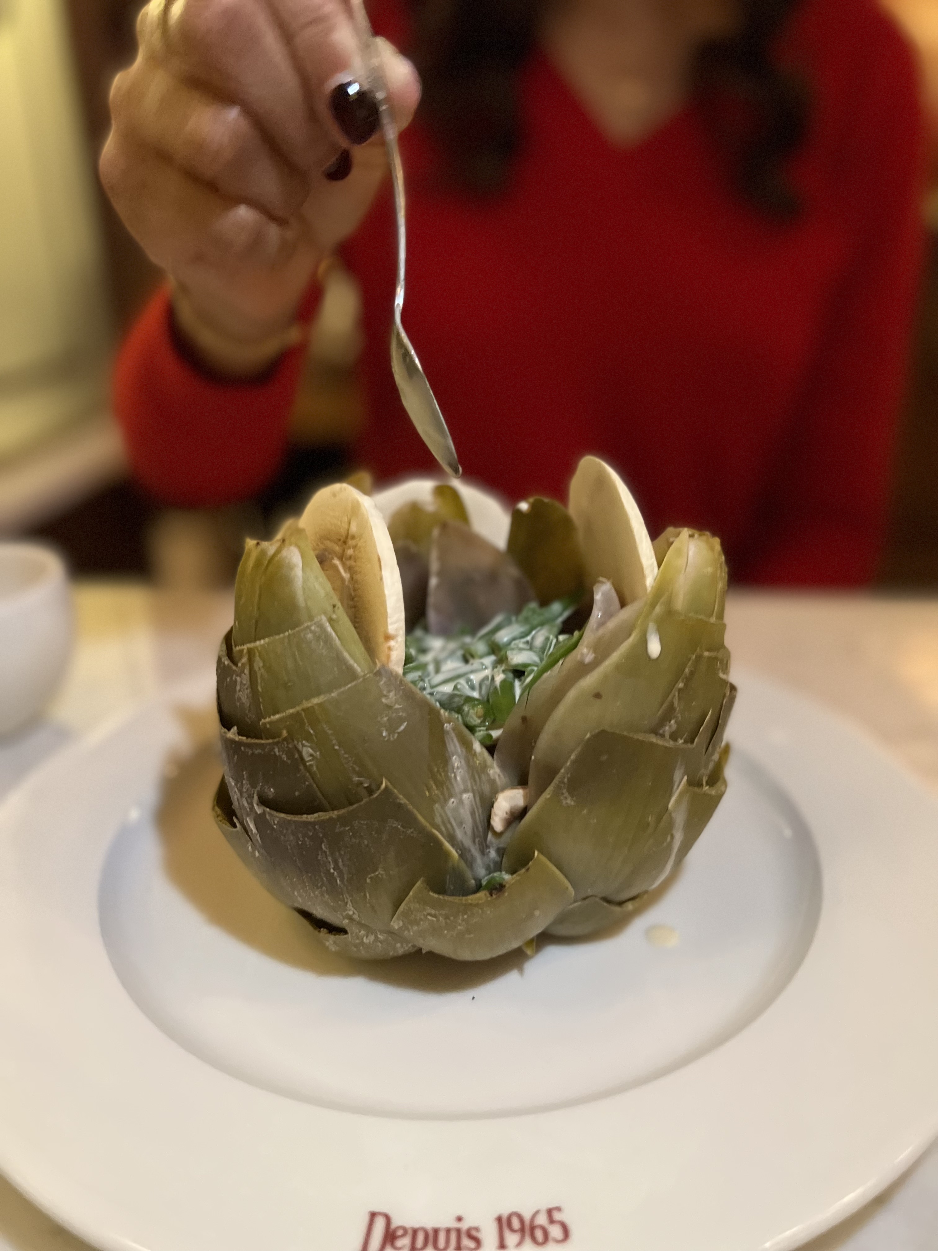 Le maître d'hôtel était très accueillant et le personnel est professionnel. Salle à manger très fréquentée et animée. Le service était excellent et la nourriture fantastique (escargots et bœuf de Bourgogne). Le serveur avait bien sûr d'excellentes suggestions pour le vin (je suis un barbare donc c'était bien d'avoir quelqu'un de compétent). Réservez à l'avance car il y a beaucoup de monde N'ayez pas peur de commander quelque chose de nouveau Vous devez essayer le rolle profit en dessert. Essayez l'entrée Artichaut (apéritif) vous me remercierez..... ...