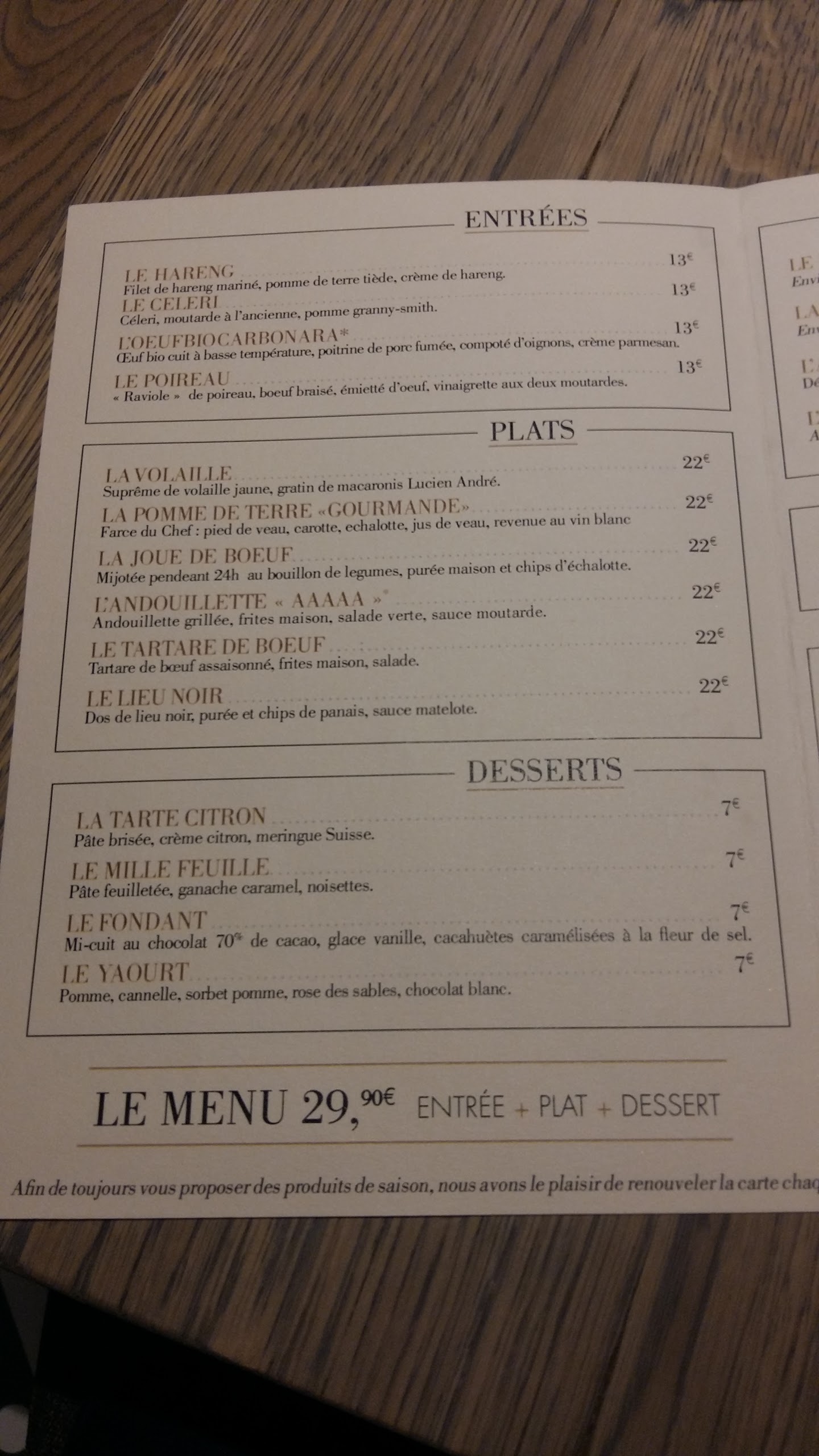 Un bistrot dans la plus pure tradition parisienne. Bonne cuisine, bon service, cadre typique. Un petit bémol sur le prix un peu élevé de certains plats.