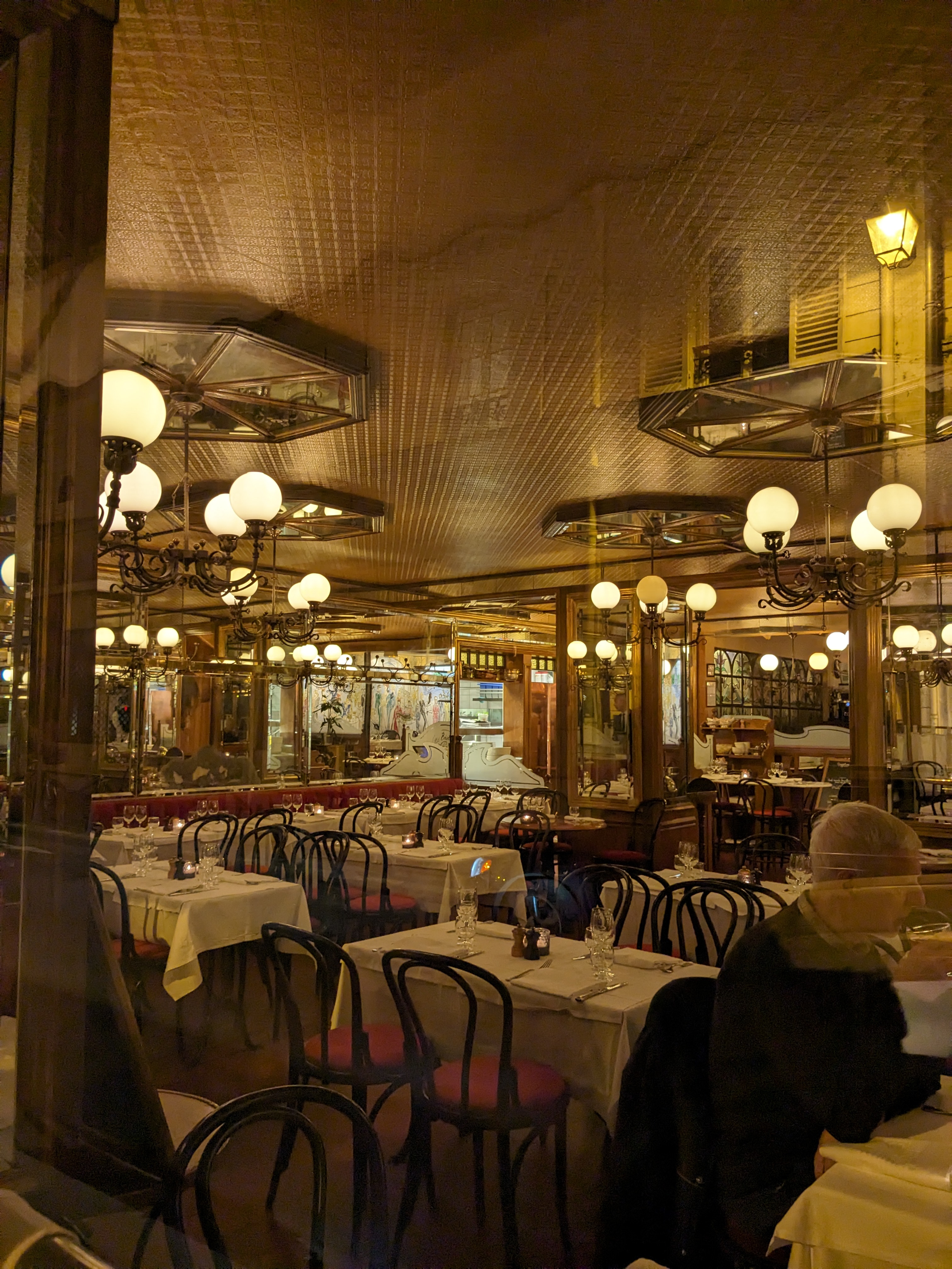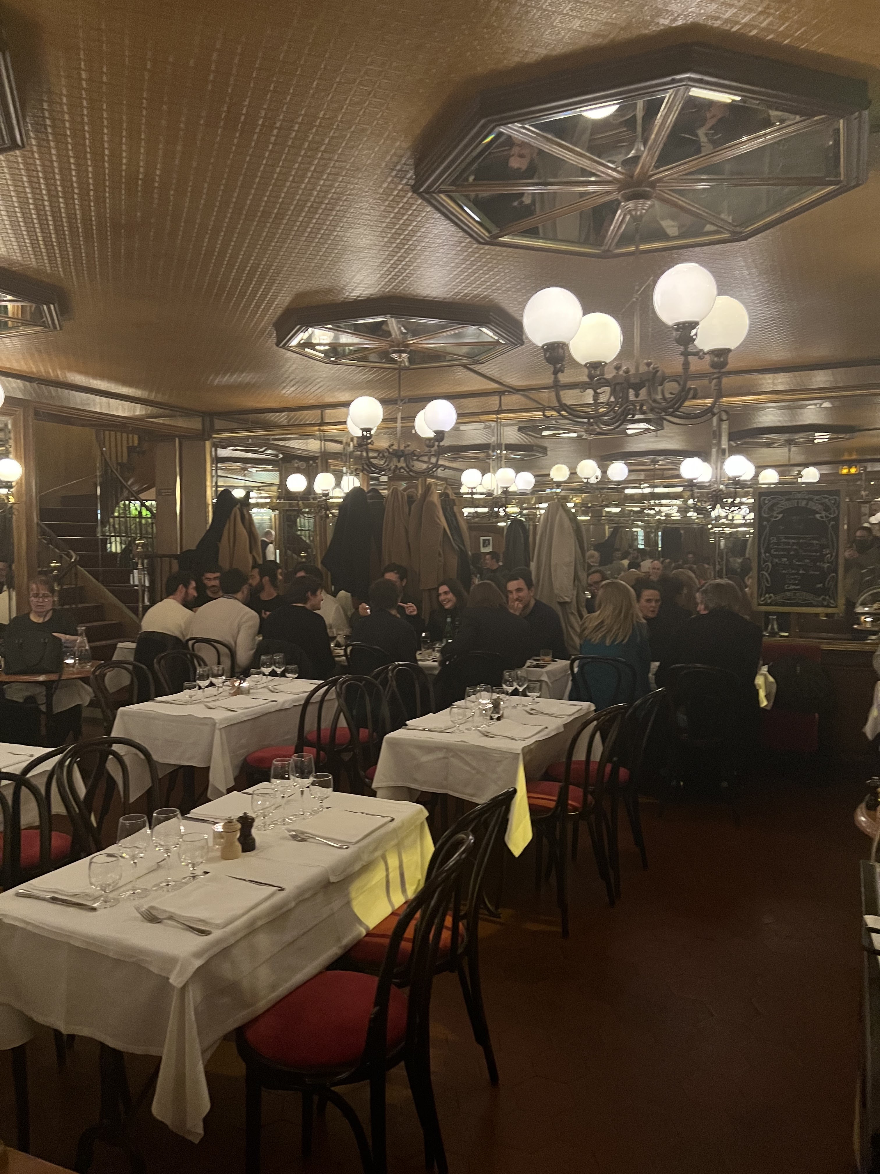 On y mange très biens endroit typique parisien les serveurs sont bien aimables et serviables je conseille les œufs en entrée simplement excellent 😉