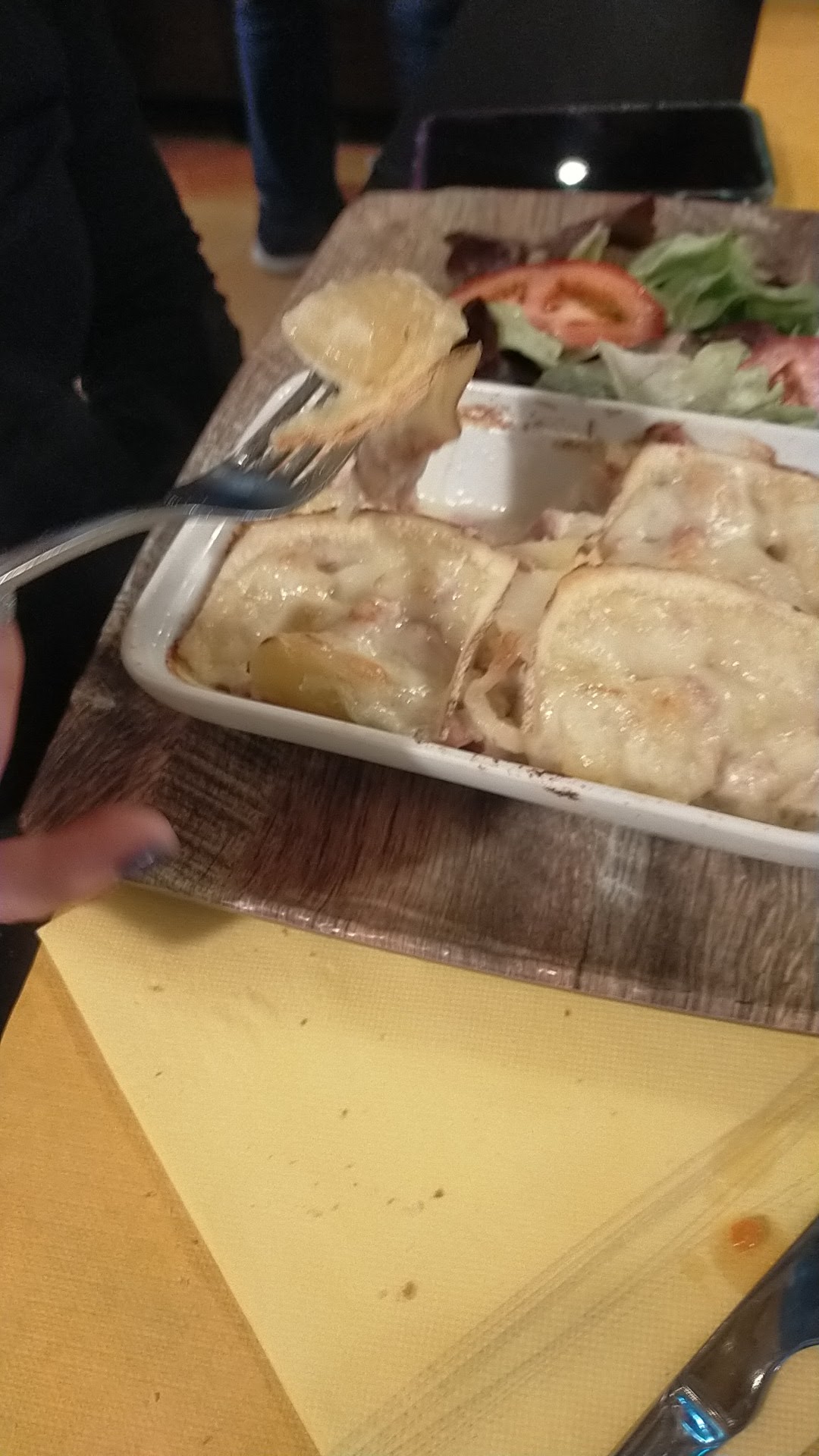 Nous sommes venus pour manger de la tartiflette. Nous avons mangé de la purée aux lardons. Crème et fromage totalement absents. Au moins, la pomme de terre était bonne. La charcuterie aussi. Autre chose, je n'ai pas apprécié la façon dont le patron s'est adressé à l'une de ses employées pour lui demander un truc banal. Il devrait se montrer un peu plus respectueux envers son personnel et ne pas traiter les jeunes gens qu'il emploi comme des moins que rien. Ce sont des êtres humains qui ne demandent qu'à apprendre ou au pire essayer de faire de leur mieux pour un travail temporaire. Ça m'a fait de la peine de voir les petits se faire traiter comme ça, vraiment.