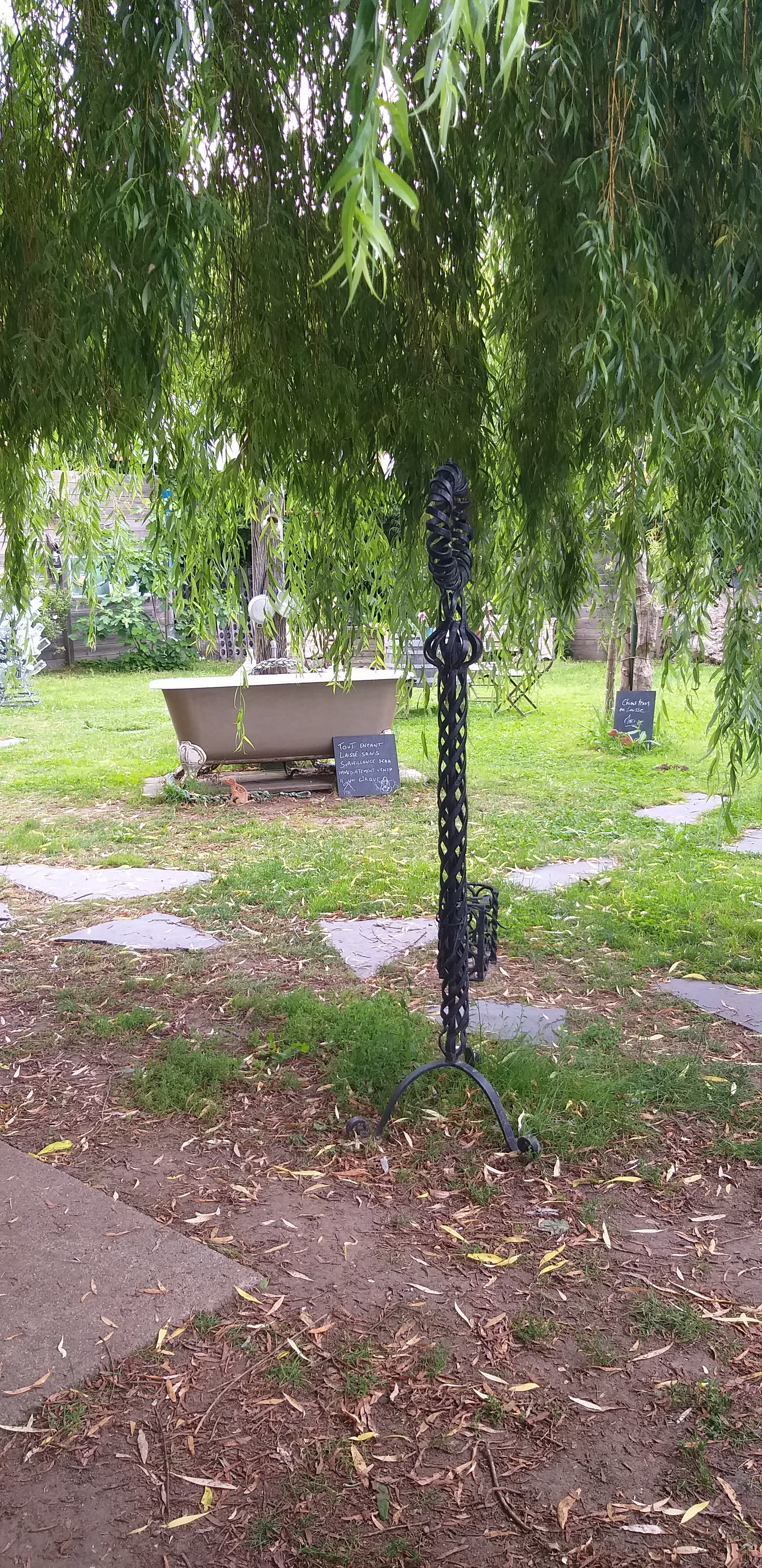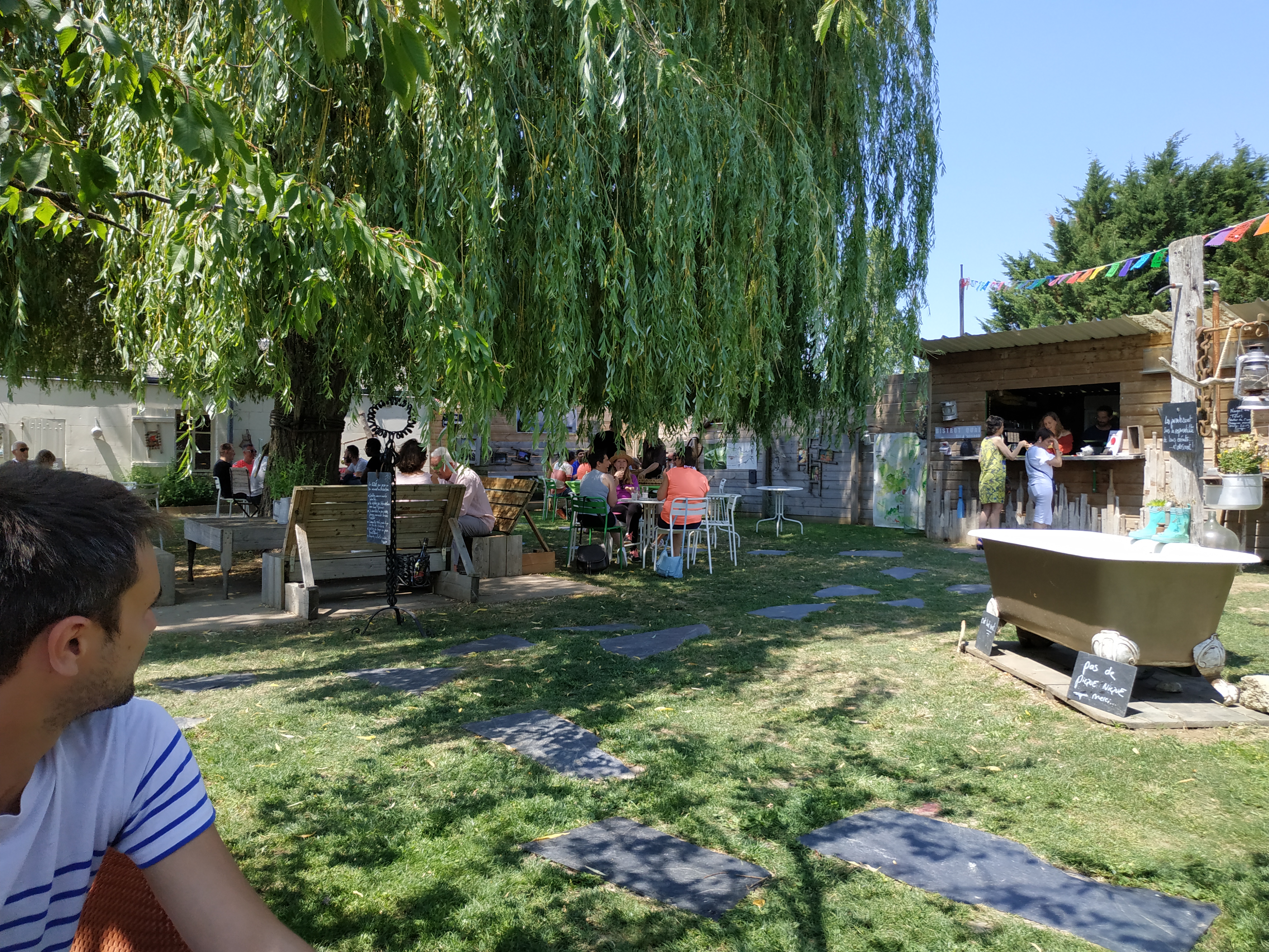 Le jardin est magnifique avec ce saule pleureur,tous ces fauteuils et canapés d'époque. Une super ambiance qui donne envie d'y retourner. Seul défaut je dirais,mais ce n'est qu'une question de goût: je trouve dommage de ne pas proposer de la nourriture préparer sur place,de vrai planches, éventuellement des frites etc. Mais sinon les produits vendu sont de très bonne qualité