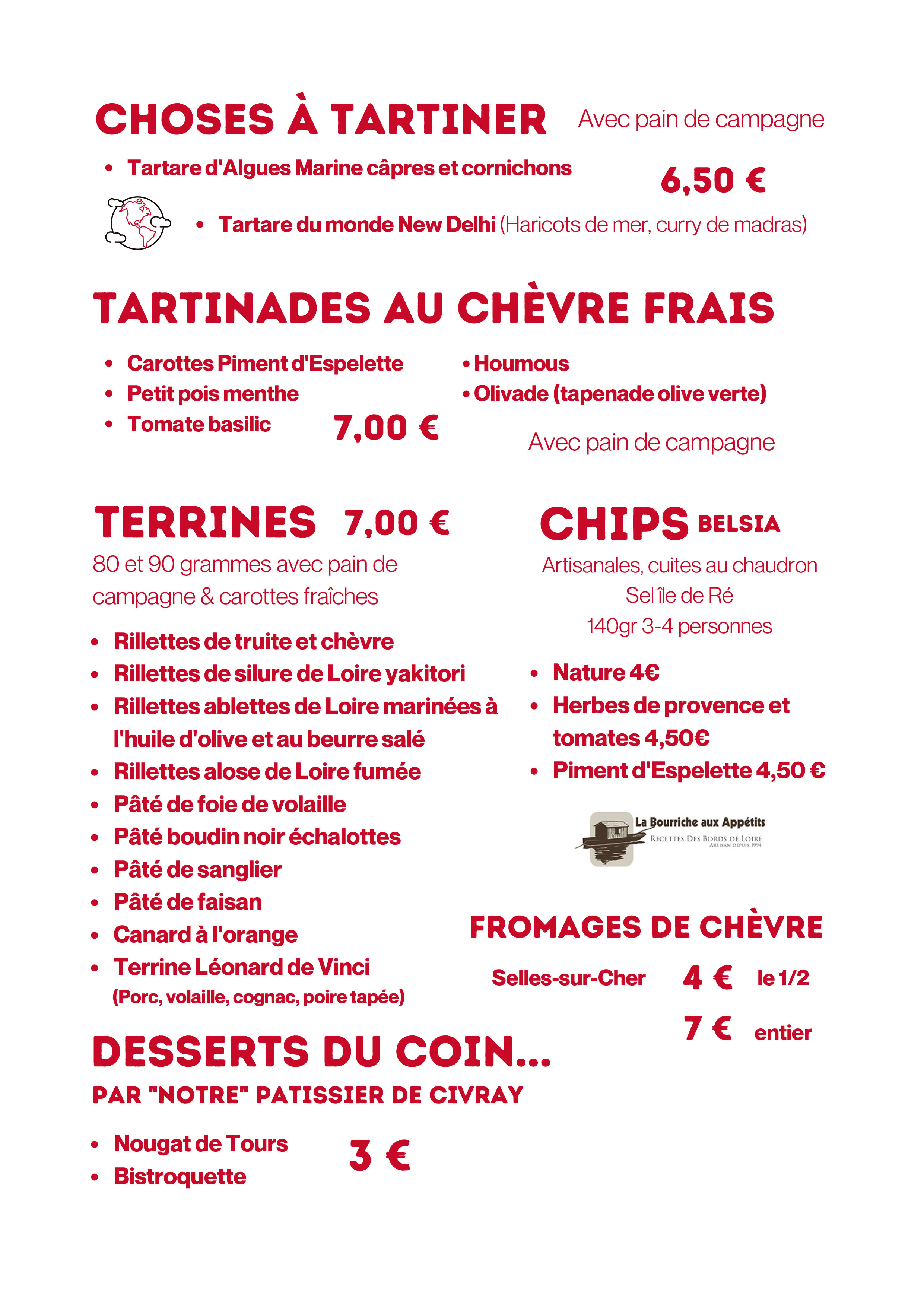 Super experience face au cher sur une petite terrasse un partage de tartines divers à se tartiner avec des chips a l ancienne. Un bon moment calme et bien decontractee. Le détour vaut vraiment la peine