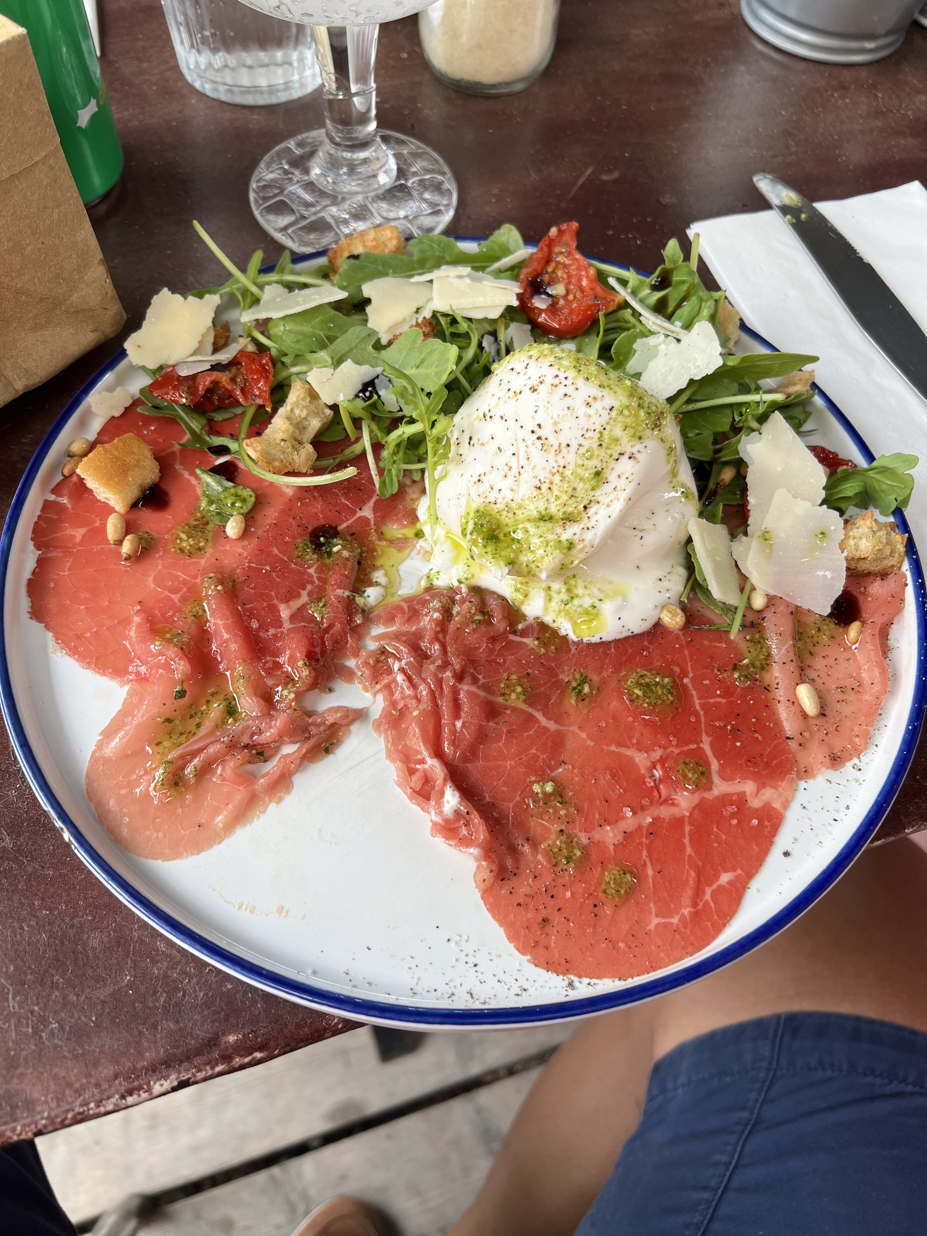 Cadre très sympa, par contre l’expérience gustative n’était pas au rendez vous, les pâtes trop cuites et la bolognaise… comment dire, au est très loin d’une vraie sauce bolognaise La salade était pas très gourmande, des concombres tranchés si fin qu’ils en sont transparents Bref