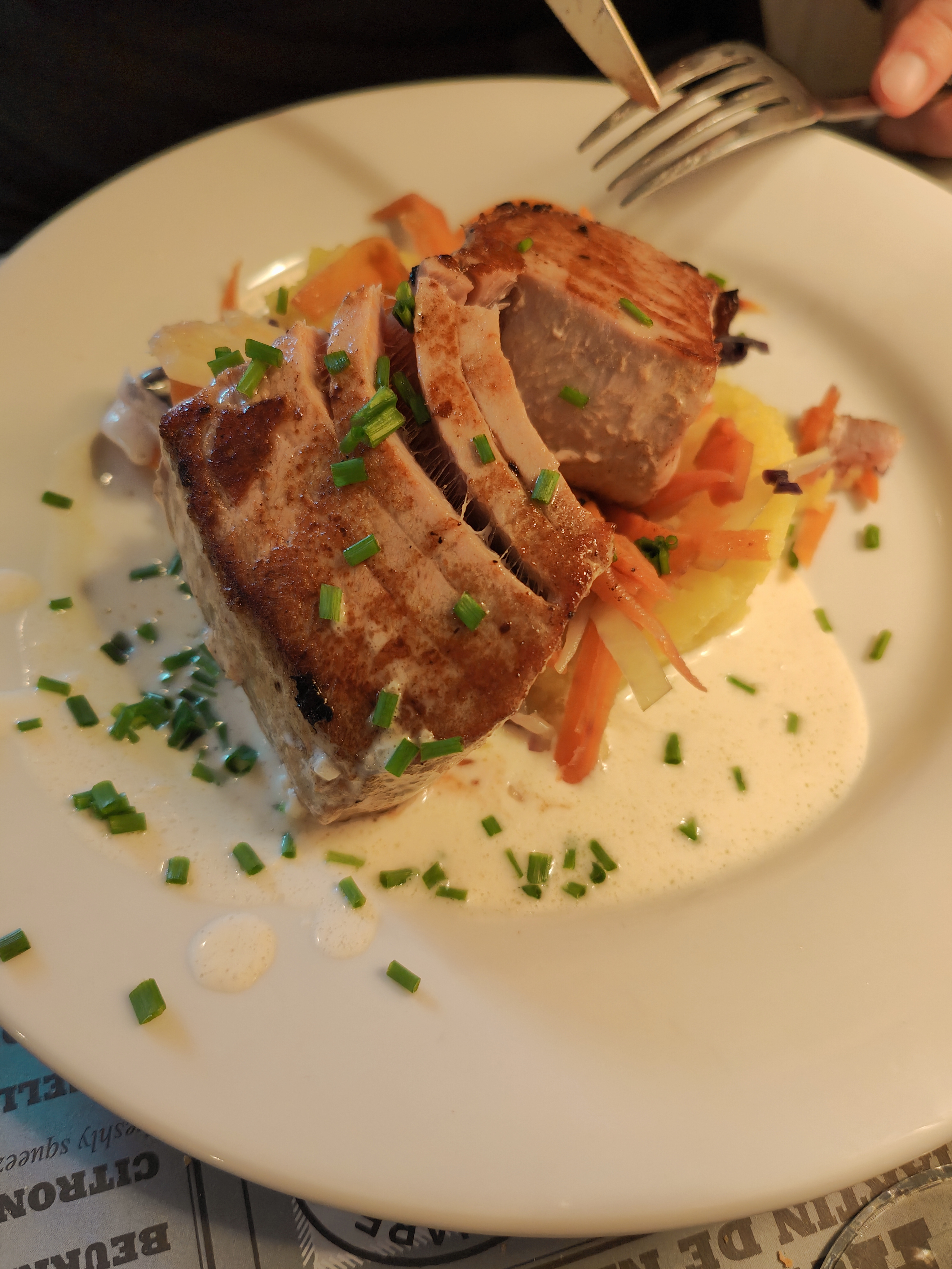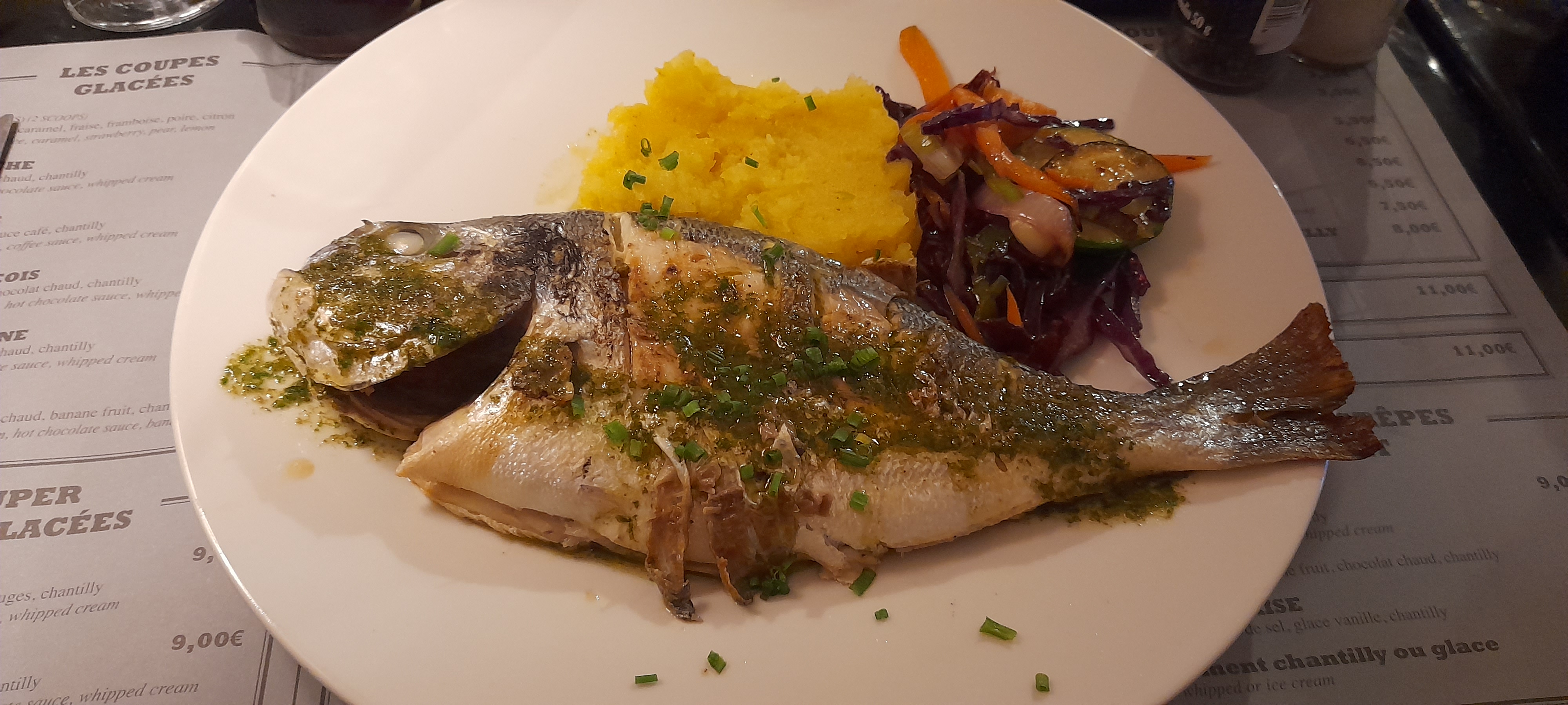 Nous sommes arrivés à 21h, mon compagnon a pris le menu à 21€90 pour entrée et plat (assiette de 6 crevettes et confit de canard) et j'ai pris un plat principal (la trilogie de la mer à 24 €). Les crevettes bien fraîches mais à décortiquer soi même, le confit de canard délicieux avec frites et salades et la trilogie de la mer, étonnamment excellent avec pommes de terre grenailles sautée. Petit point négatif : on a dû mettre nous même la table (mettre dessous de plat, couverts et verres en place), pas de sel ni de poivre quand on s'est assis. Personnels gentils et agréables.