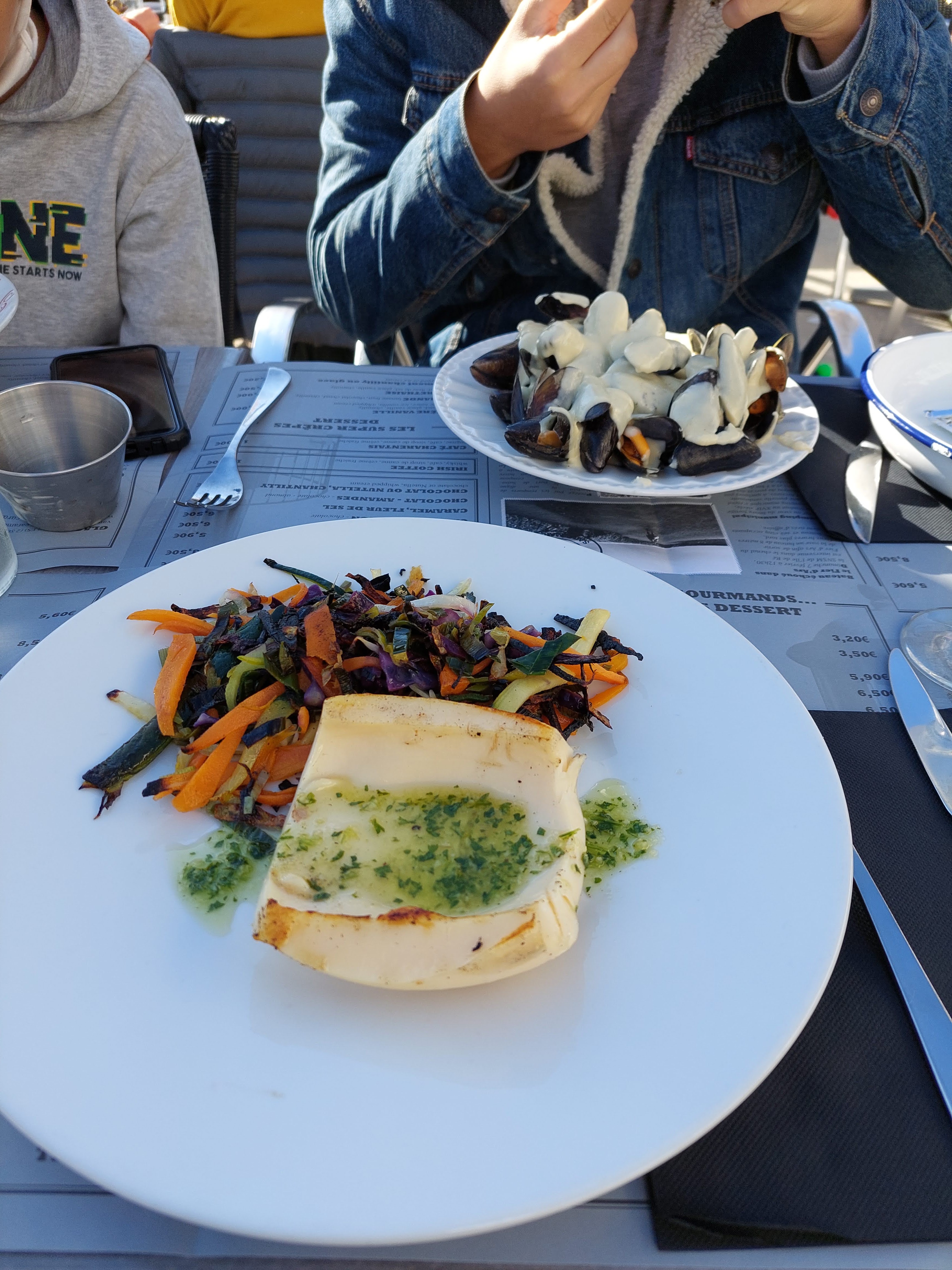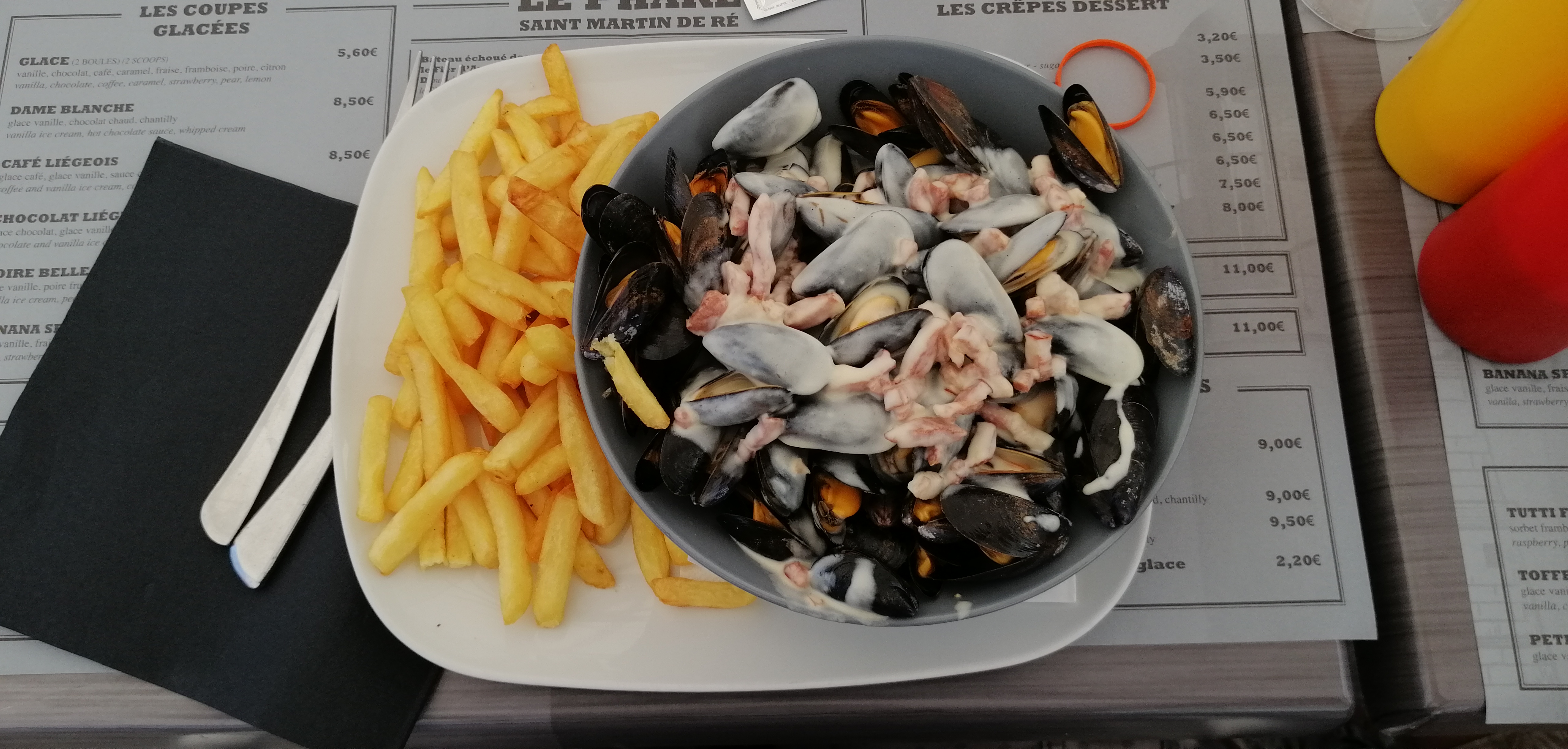 Juste DOMMAGE ! Serveurs tous très sympathiques sauf la patronne qui apparemment n'est pas faite pour ce métier. Elle n'hésite pas à râler auprès de ses collègues devant les clients et nous avons attendu presque 1h et avons été servis après 2 tables arrivées 15min au moins après nous. Les moules étaient délicieuses, le cadre et le personnel sympas mais l'attente a un peu gâché le repas et il n'a pas du tout été possible d'obtenir un geste commercial soit disant parce que nous sommes en juillet et qu'il y a du monde. Ce qui a réduit l'addition car nous n'avons pas prolongé avec un dessert. Ce restaurant est très mal organisé. Nous avons eu 4 voire 5 serveurs qui nous ont demandé si l'on s'occupait de notre table.