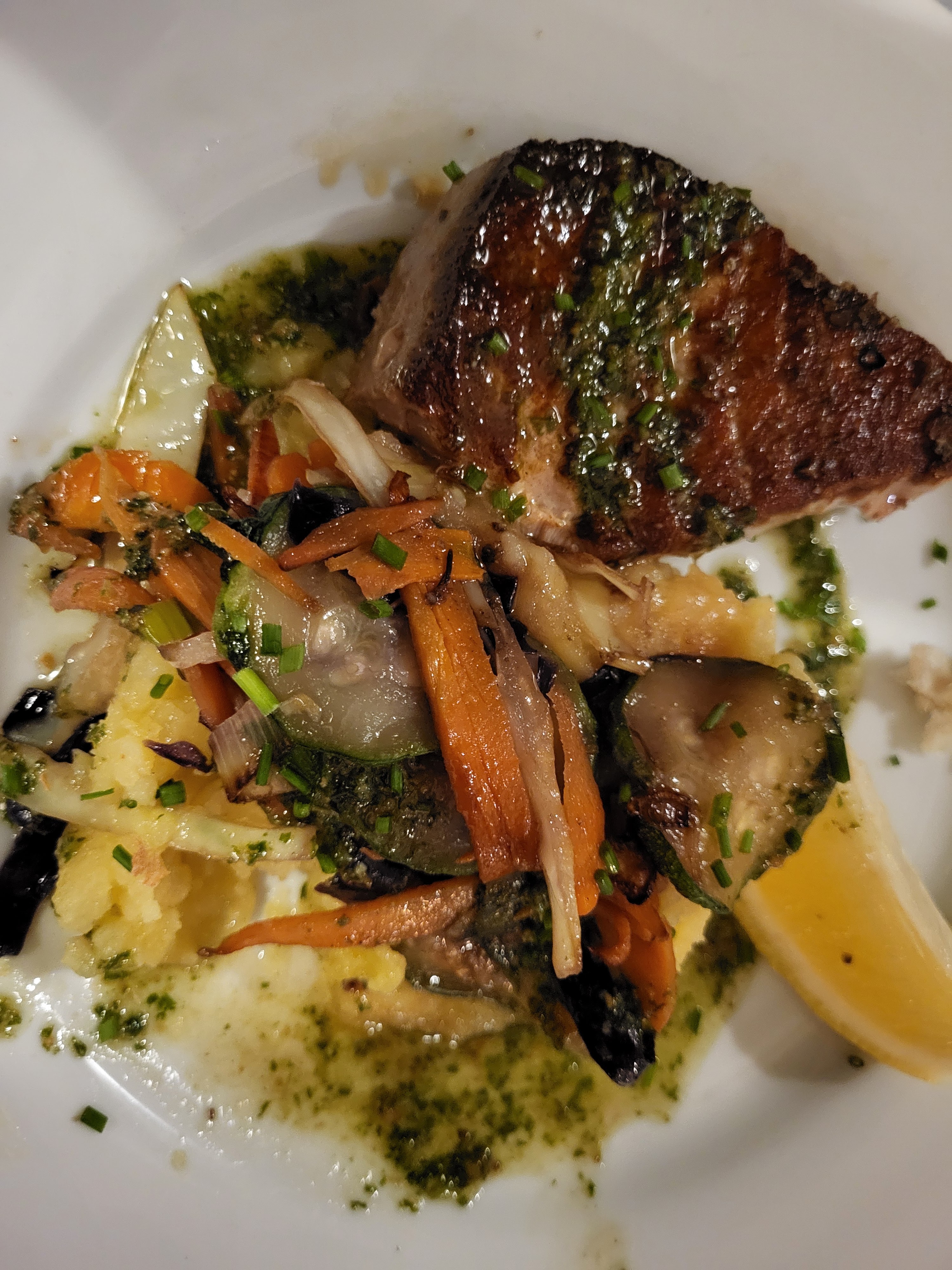 Ambiance et personnel très sympa...au menu la raie est excellente presque trop grosse pour nous...île flottante faite maison et prix raisonnable..une bonne surprise et surtout un des seuls ouvert à st Martin en semaine