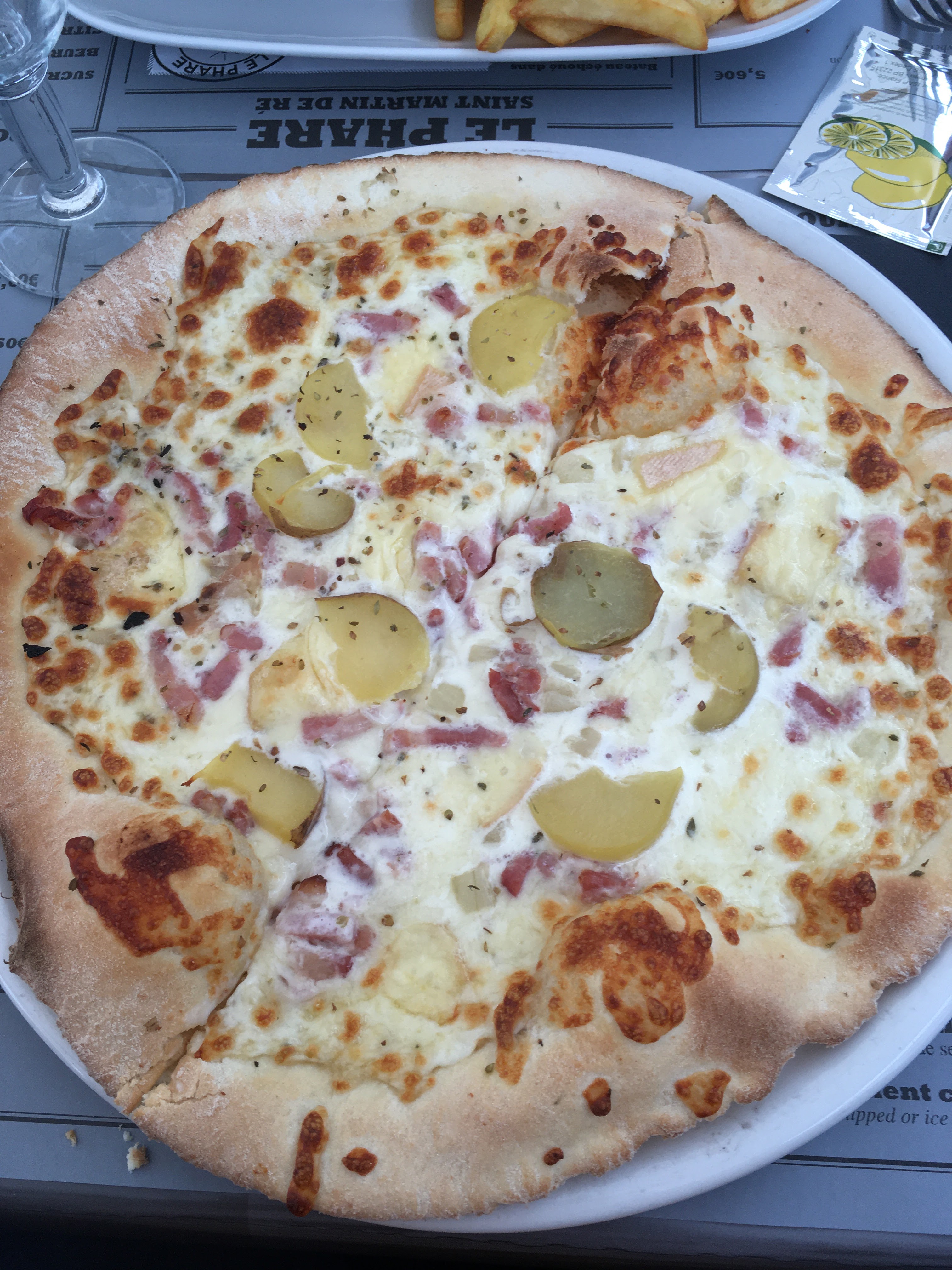 16€ une pizza avec une fausse Mozza... Des frites... surgelées bien sur et encore moins bonnes qu’au Kebab du coin ( on dirait sincèrement des frites de cantine) C’est vraiment dommage de proposer de la si basse qualité quand on voit la position géographique du restaurant. C’est pour moi un attrape touriste, vous ne risquez pas de ressentir les saveurs de l’ile de Ré ! Le service quand a lui fut excellent, les serveurs/ serveuses sont au petit soin.