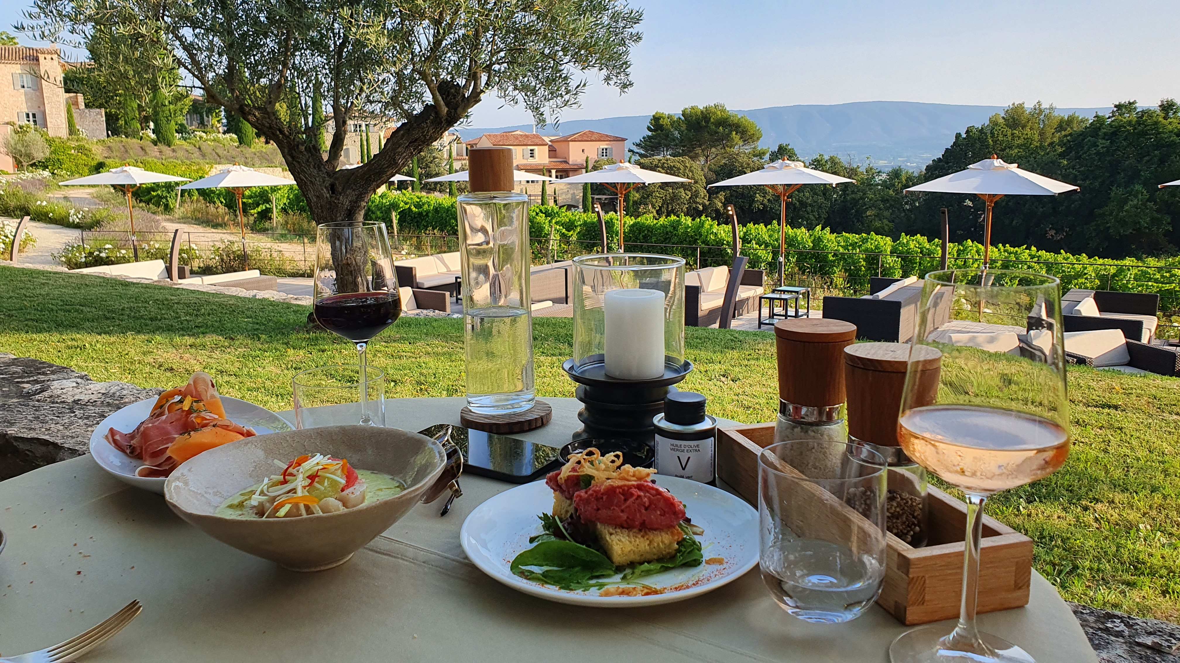 Je laisse très rarement des avis mais je me sens obligé de partager quelques retours à cette occasion. La vue est superbe et le service est courtois et professionnel mais la nourriture est au mieux bien en dessous de la moyenne. Le poulet de Bresse était extrêmement caoutchouteux (beaucoup trop cuit) et la sauce insipide et bien trop liquide. Heure d'amateur absolu. Les entrées étaient au mieux oubliables et un seul dessert (le plat de glace à l'huile d'olive) se démarquait vraiment sur 6 plats. Je vous déconseille fortement ce restaurant, il y a beaucoup d'établissements phénoménaux dans le Luberon et celui-ci est tout simplement une honte côté gastronomie (la Table du Mas est à 20 min en voiture et je peux vous assurer que vous repartirez de ce restaurant avec des souvenirs pour durer toute une vie pour le même prix). Cet hôtel devrait vraiment envisager d'embaucher un véritable chef.