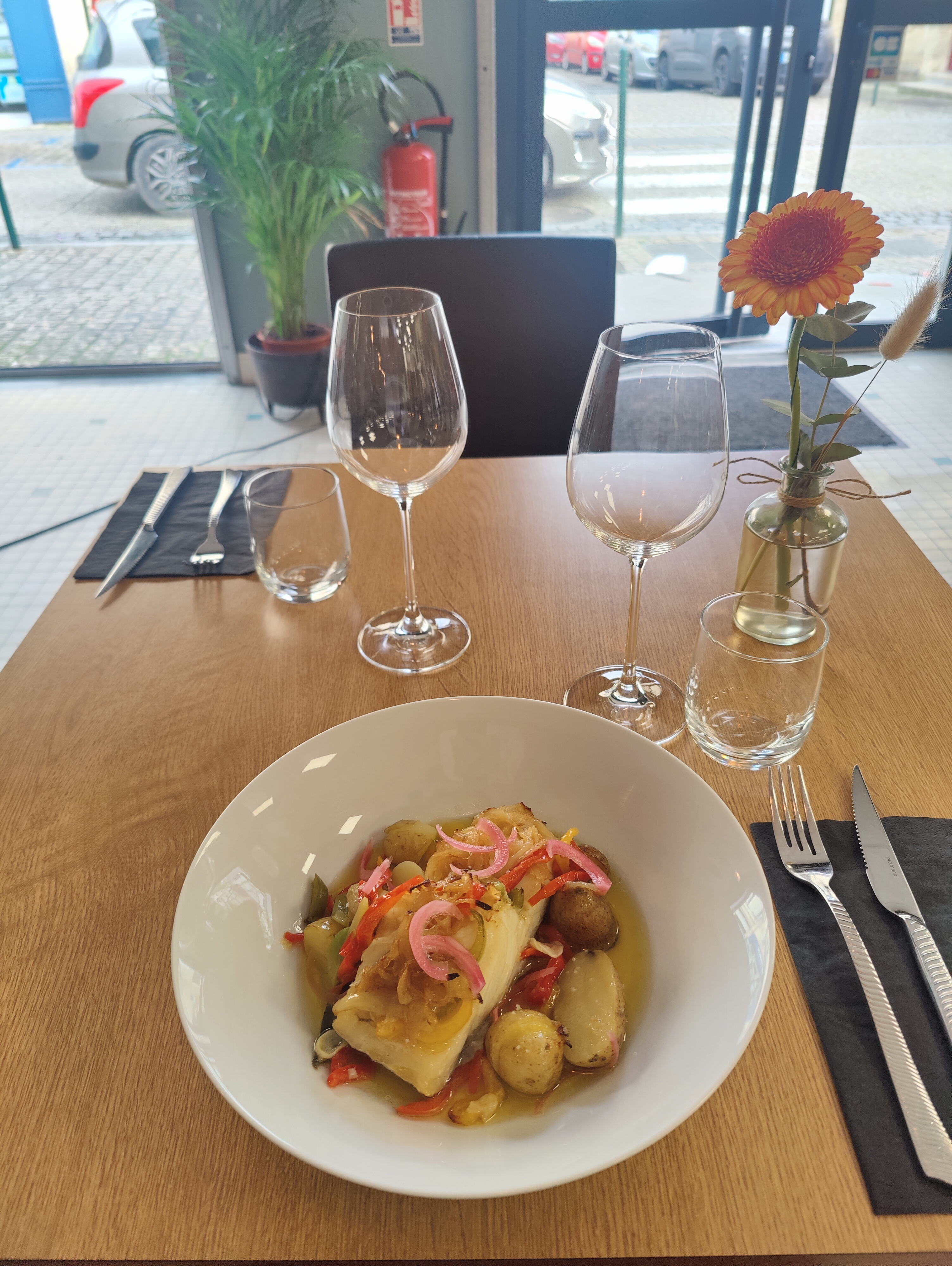 une belle surprise et découverte que cet établissement ! Cuisine gastronomique franco portugaise pleine de saveurs, excellent acceuil et service, décoration soignée …( tableaux d’artistes exposés ) et épicerie fine ( un vinaigre au miel et sureau , une pépite !) Coup de cœur