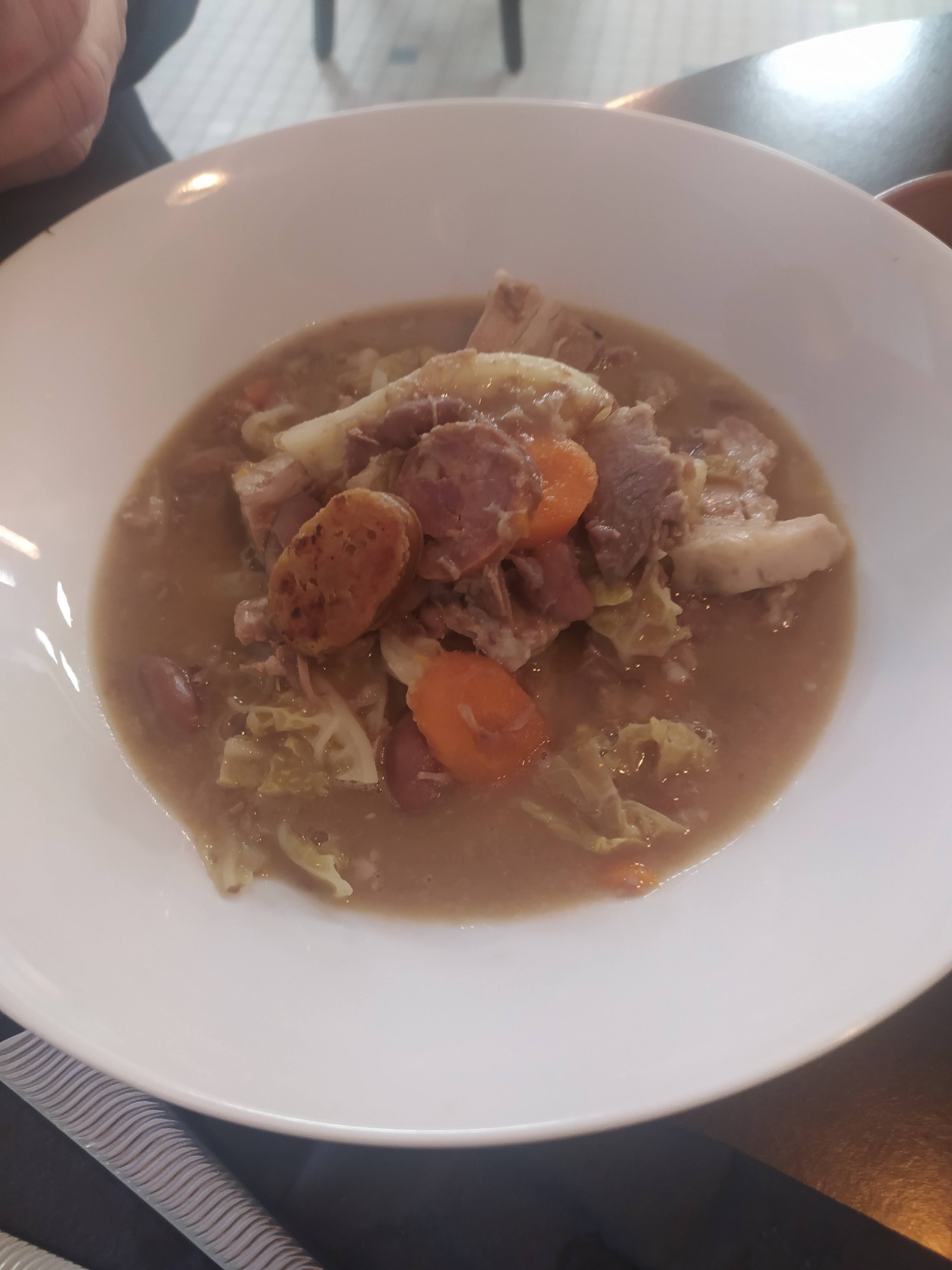 Exceptionnel !!! Nous avions le menu du jour et la soupe à la citrouille était quelque chose de spécial. Le plat principal - les Aiguillettes de Poulet - était servi avec un riz spécial. Le dessert était un gâteau à la poire avec une boule de glace vanille - la poire était tranchée très finement et servie sur une crème vanille... Il n'y avait pas que la nourriture qui était particulièrement bonne - le patron nous a tout expliqué avec beaucoup de patience et a pris beaucoup de temps pour nous et n'arrêtait pas de nous demander si tout allait bien sans être intrusif... Les portions sont généreuses et nous sommes rentrés chez nous très rassasiés et satisfaits...