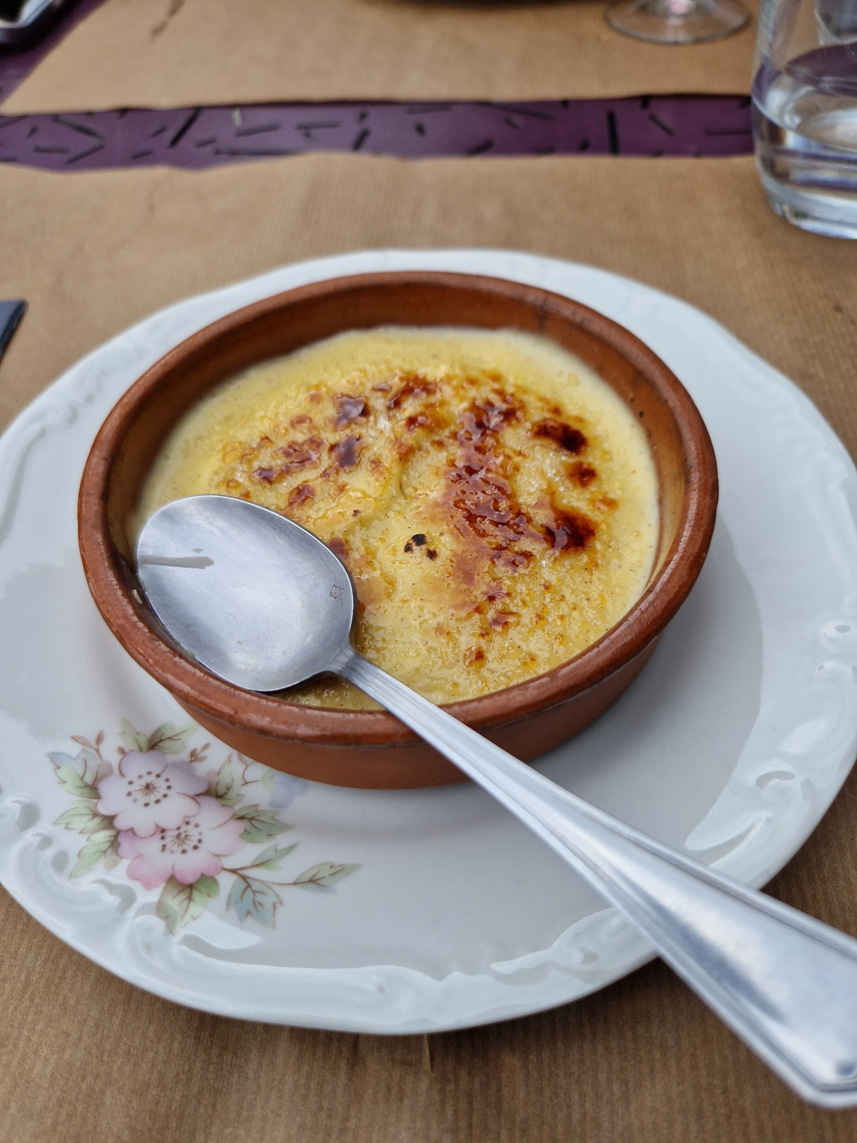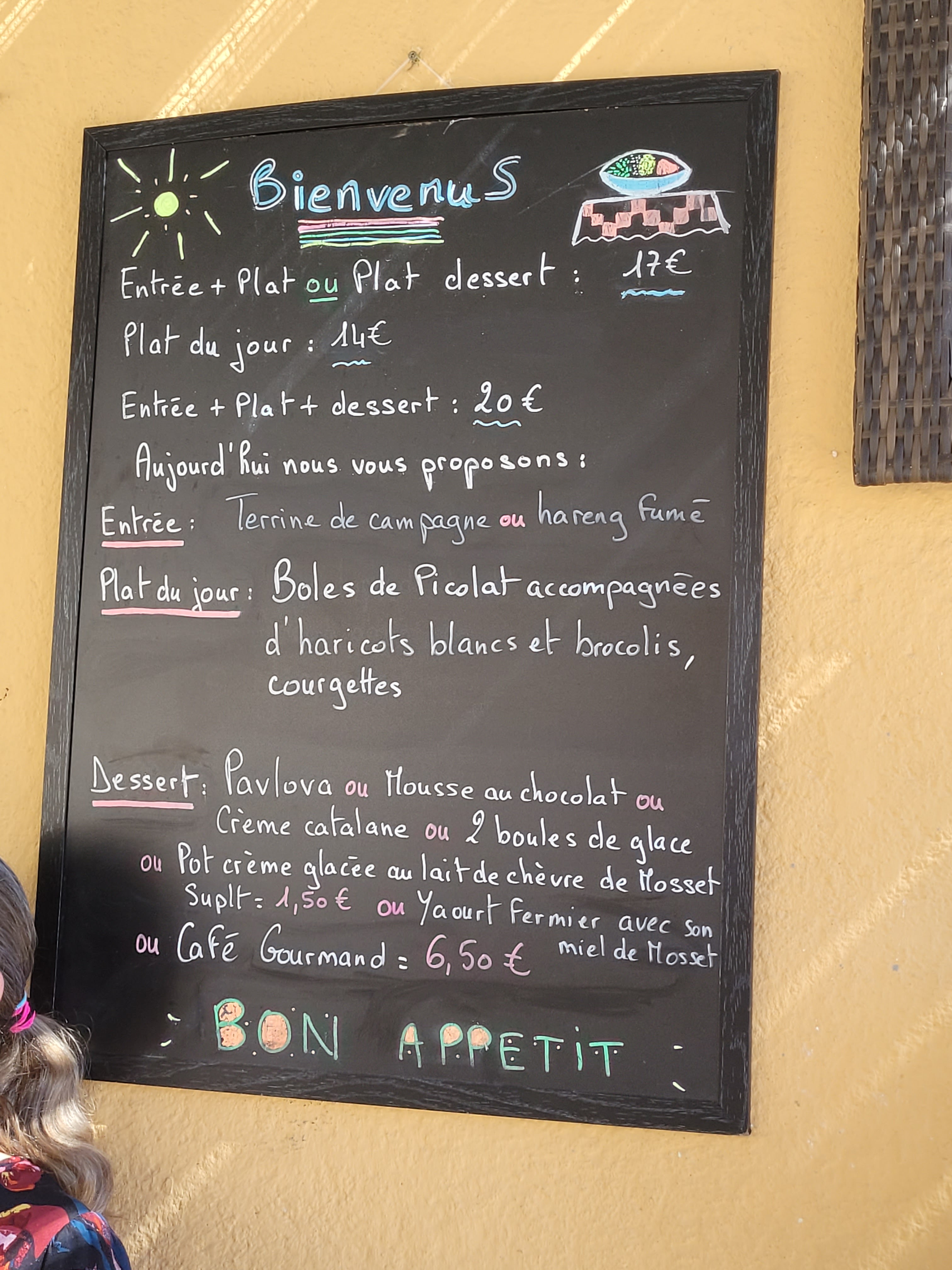 Nous avons fait le plat du jour à 10€ très bon. + Desserts 3 €. Il est recommandé de s'asseoir sur la terrasse et de manger en plein air avec une vue impressionnante. Le service est calme mais pertinent. Ils ne parlent pas catalan mais pas de problème pour nous comprendre, il n'y a pas trop de choix. Plat du jour normal ou complet + 4 €. Normal + dessert c'est assez bien.