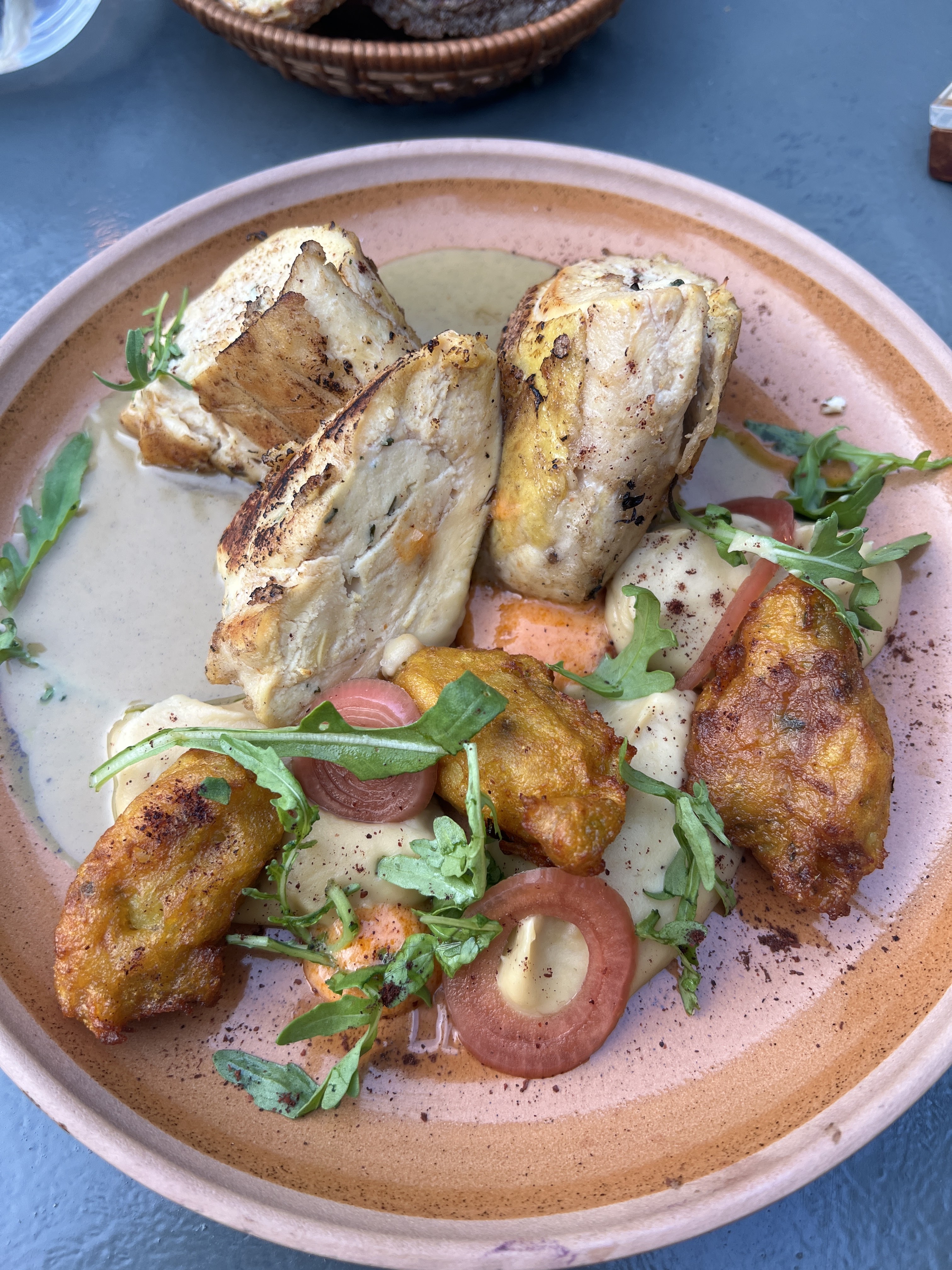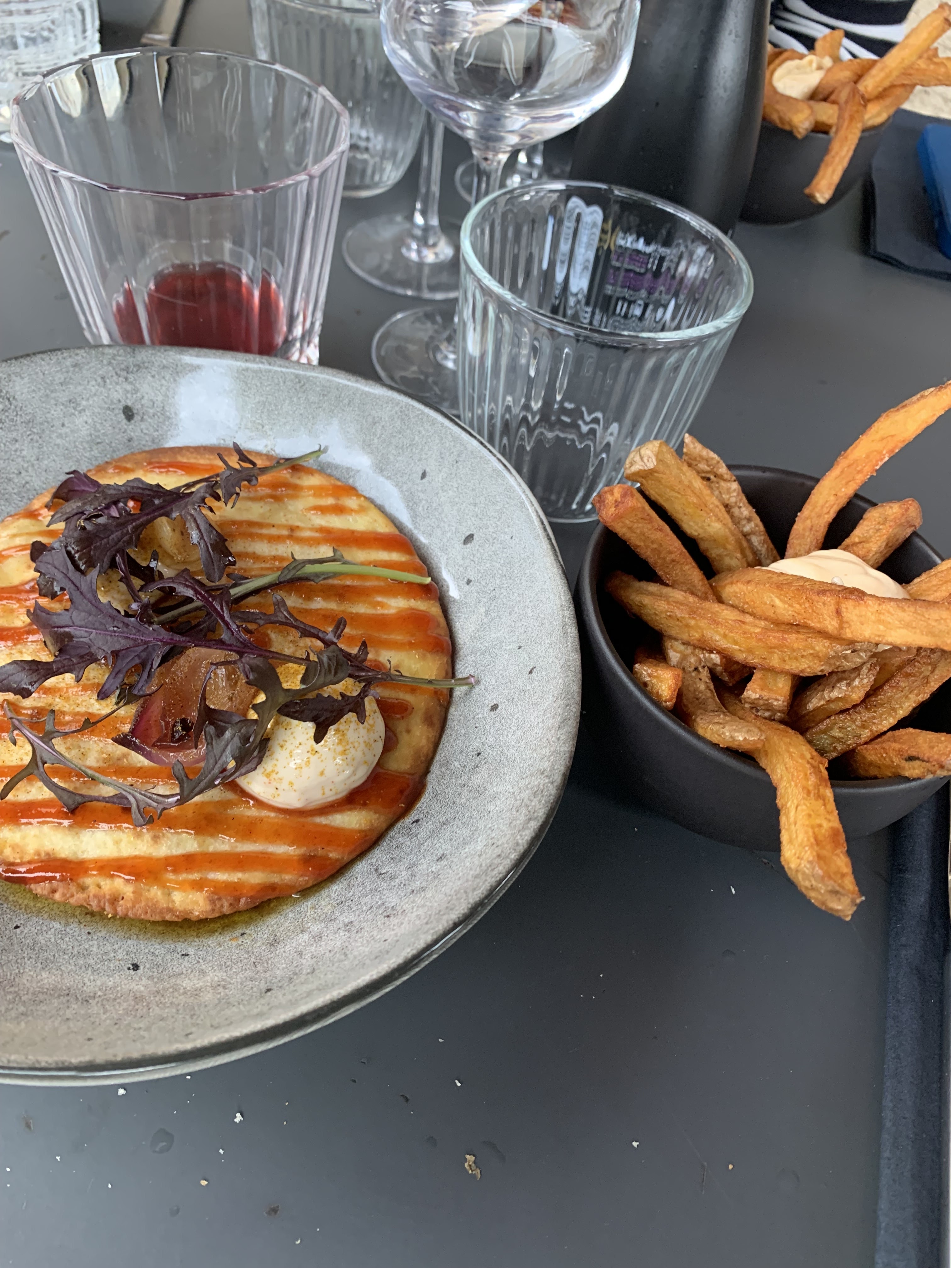 A tout ceux qui sont de passage où qui habitent pas loin, allez y !!!! C'est une belle découverte qui vous attend. De la vraie cuisine ! Nous avons pris en entrée tarte tomate et arancini. L'arancini est juste délicieux. La tarte tomate simple mais tellement bien faite, la pâte évidemment maison (tout est maison) est incroyable. En plat nous avions pris le fish tacos, bravo pour l'originalité de ce plat, tellement bien maîtrisé, excellent, même les frites étaient trop bonnes ! A la carte 3 entrées, 3 plats, 3 desserts. Ça en dit long sur la qualité et la fraîcheur des produits. Je pourrais en parler encore longtemps mais je vais m'arrêter là. Terrasse agréable Bref, je recommande+++++ PS: le chef est génial 😉
