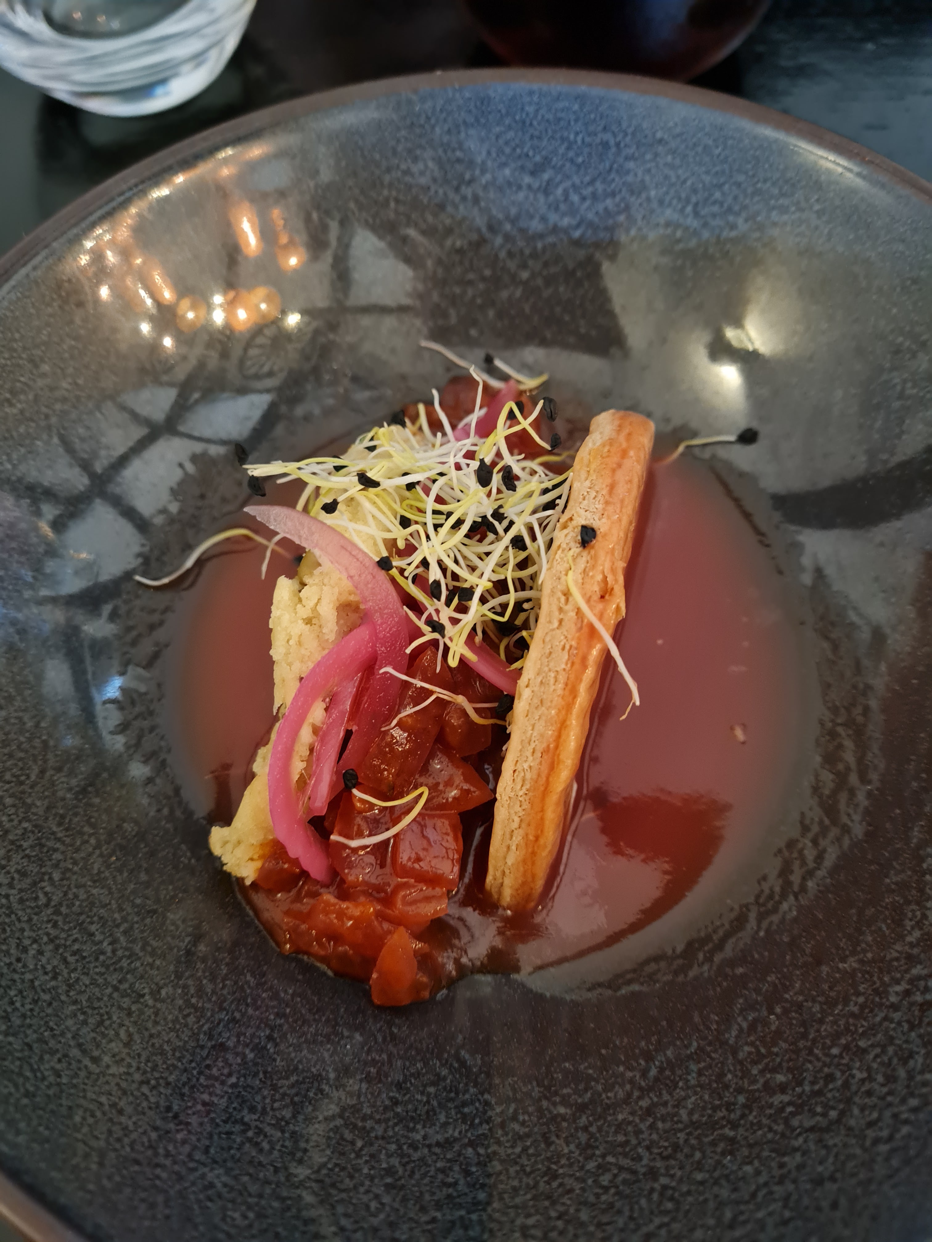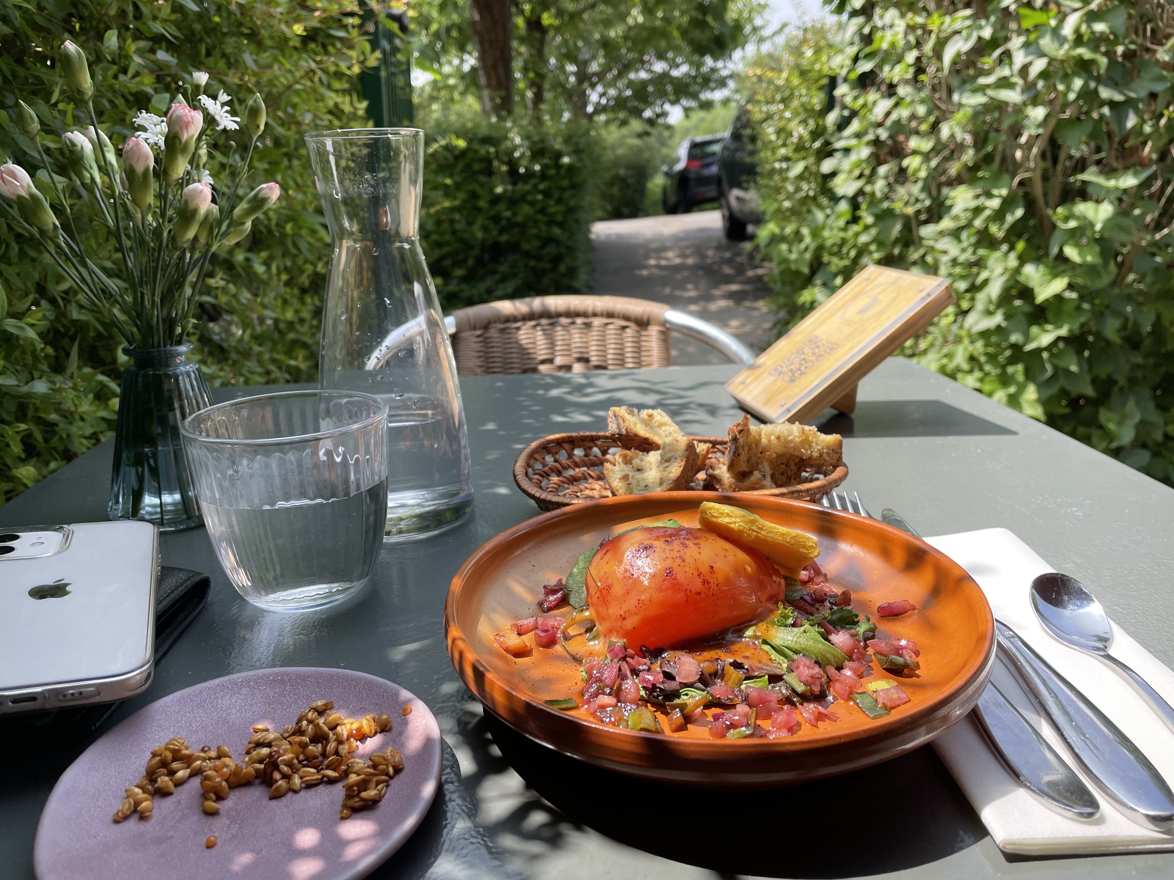 Belle découverte ! Le restaurant est situé au calme et possède une grande terrasse. Nous ne sommes pas les uns sur les autres, c'est très appréciable. Le dressage est parfait. Le chef est très sympa et vient voir ses clients durant le service s'il le peut. La tarte aux légumes marinés était délicieuse ! Experience à renouveler pour nous.